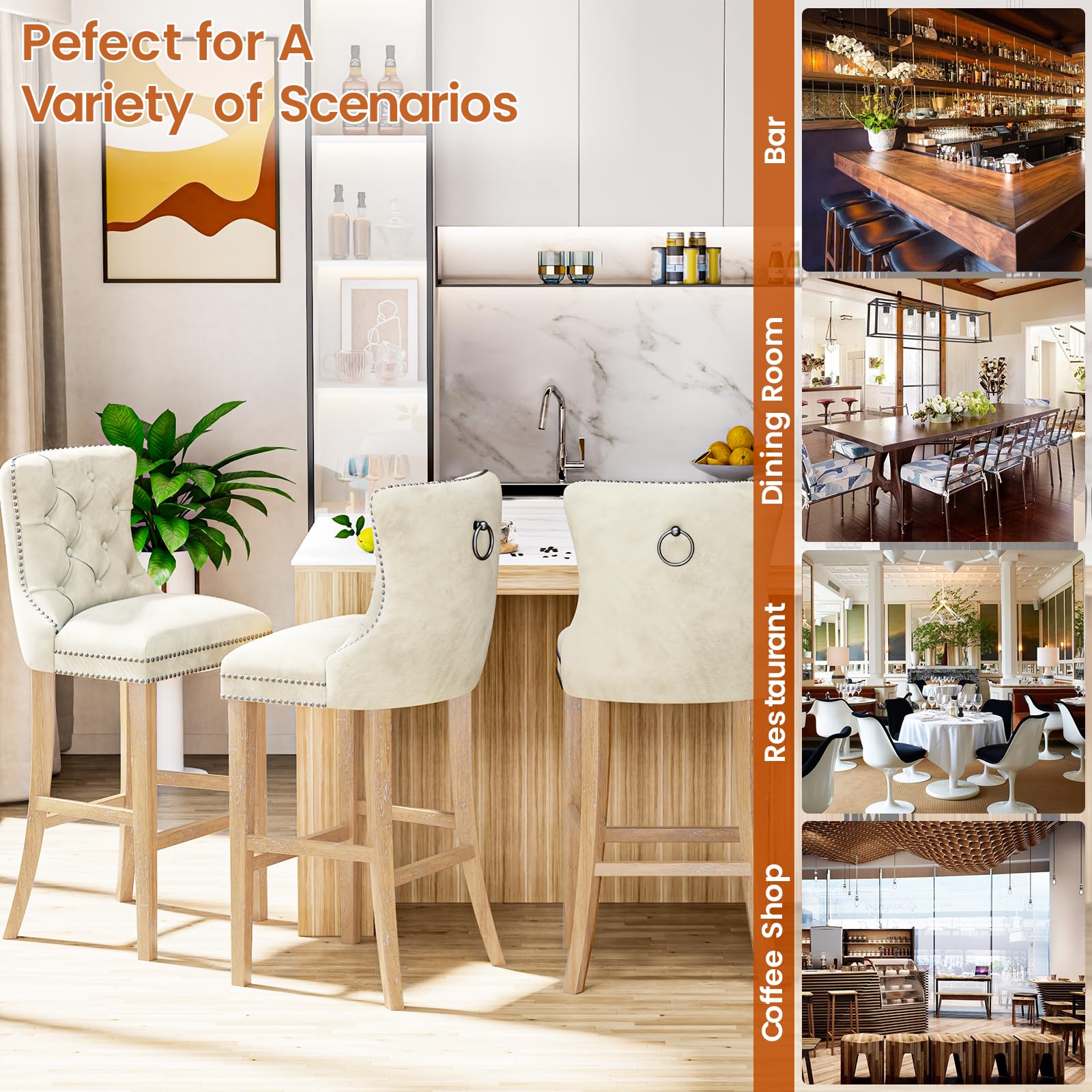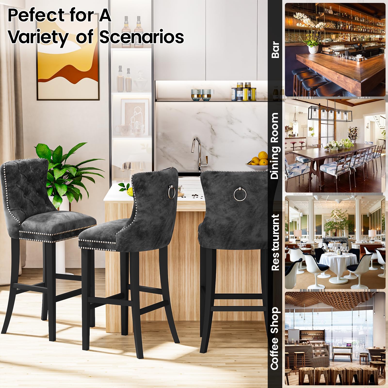 Bar stool with backrest The velvet used in this kitchen island seat is very soft and comfortable, with a little fluff on the surface, which will definitely not cause discomfort to the skin. In addition, the high backrests of these high bar chairs have a certain tilt angle, so you won't feel tired after sitting for a long time. The footrests on the legs of the kitchen stools provide more relaxation for the legs.