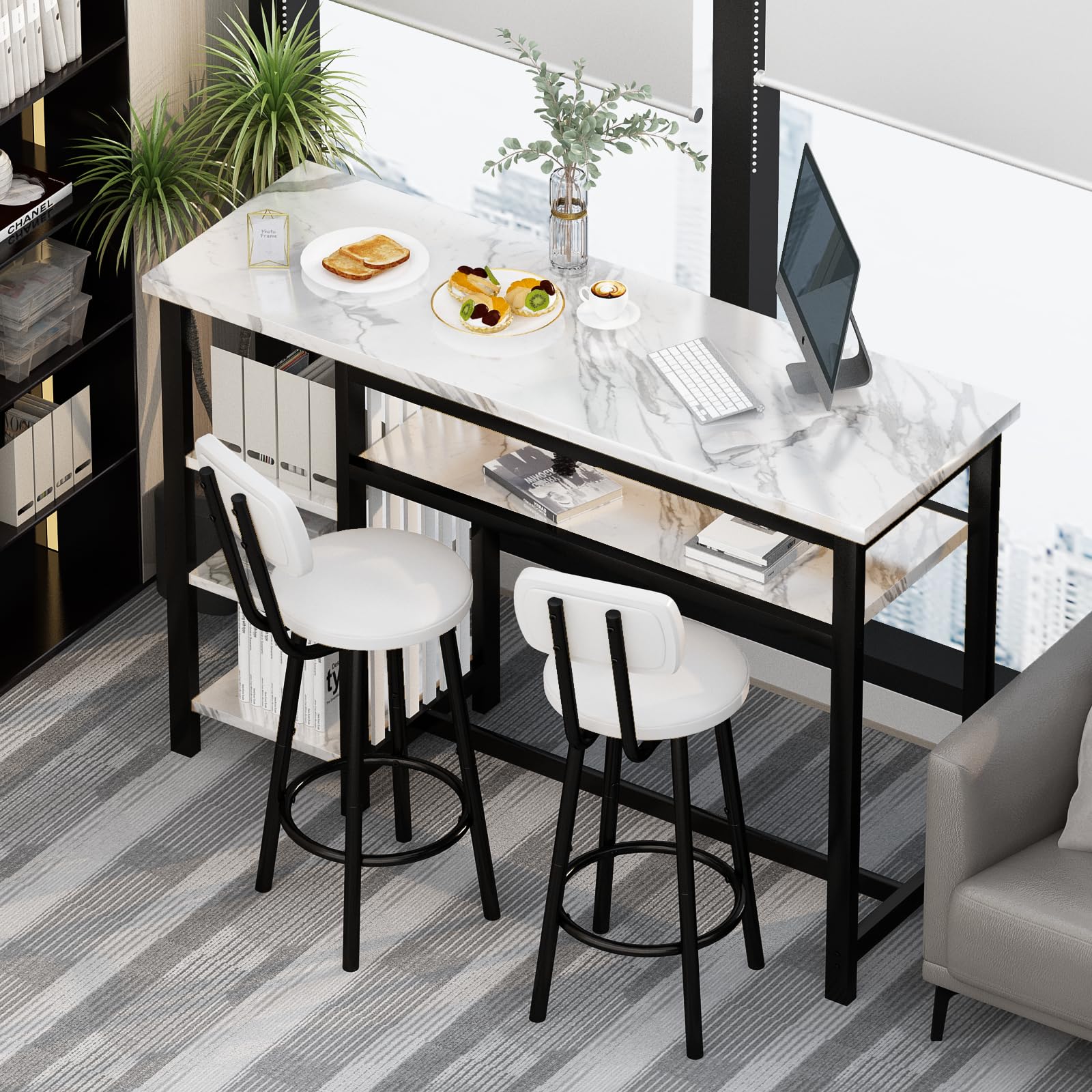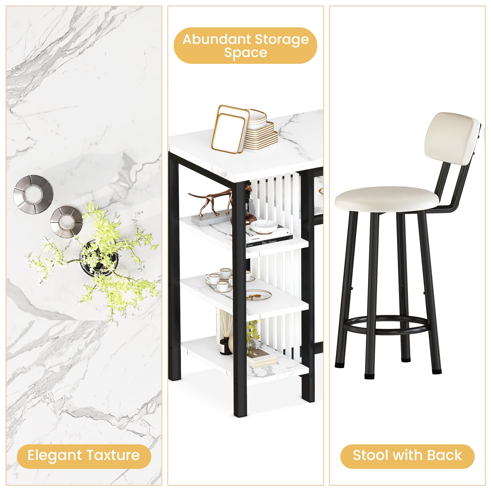 AWQM Marble 3 Piece Bar Table and Chairs Set, 2 PU Cushion Bar Stools