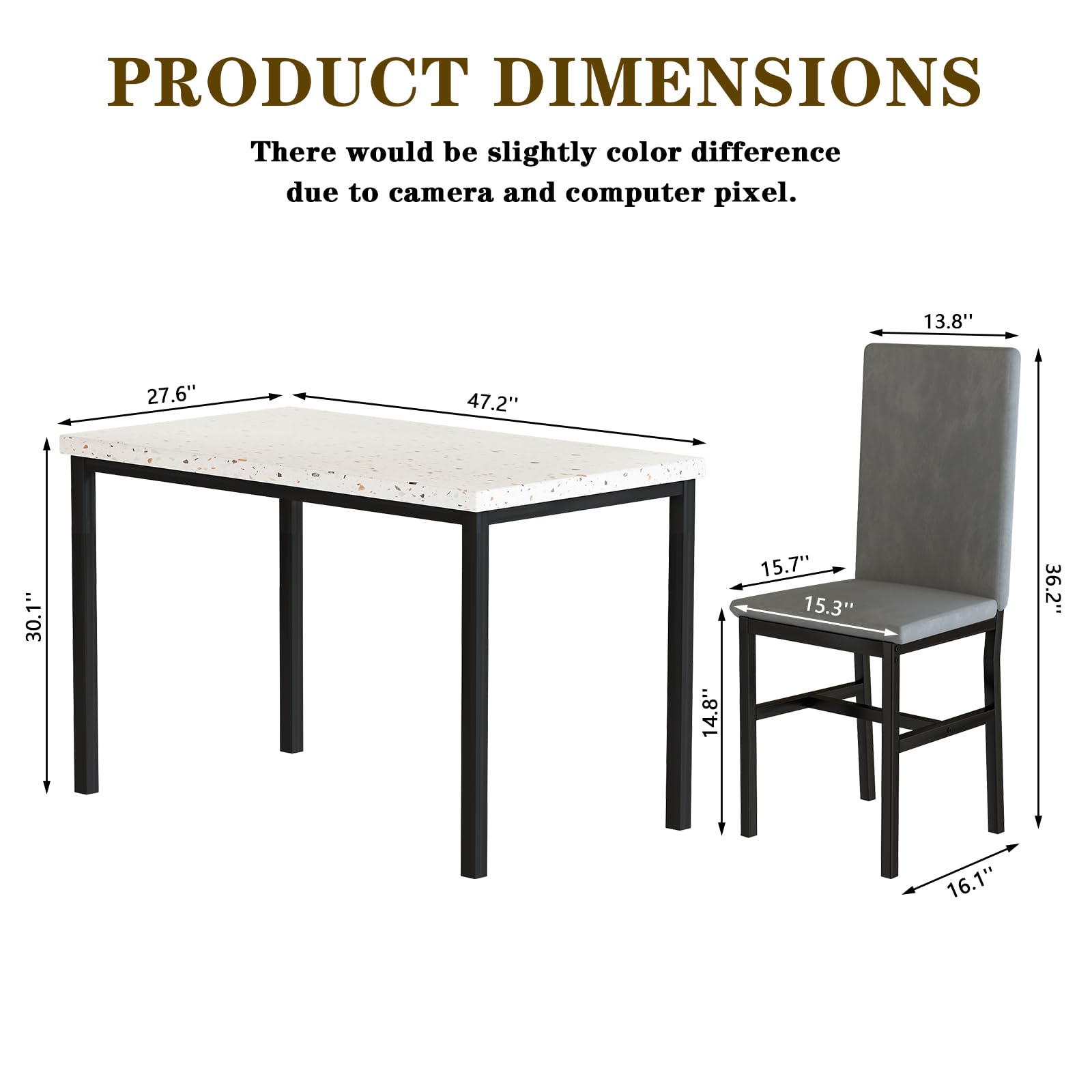 🌟[SIZE] The marble dining table set includes a spacious dining table measuring 47.63 inches long x 27.6 inches wide x 30.12 inches high and four chairs measuring 15 inches long x 16 inches wide x 36.2 inches high.