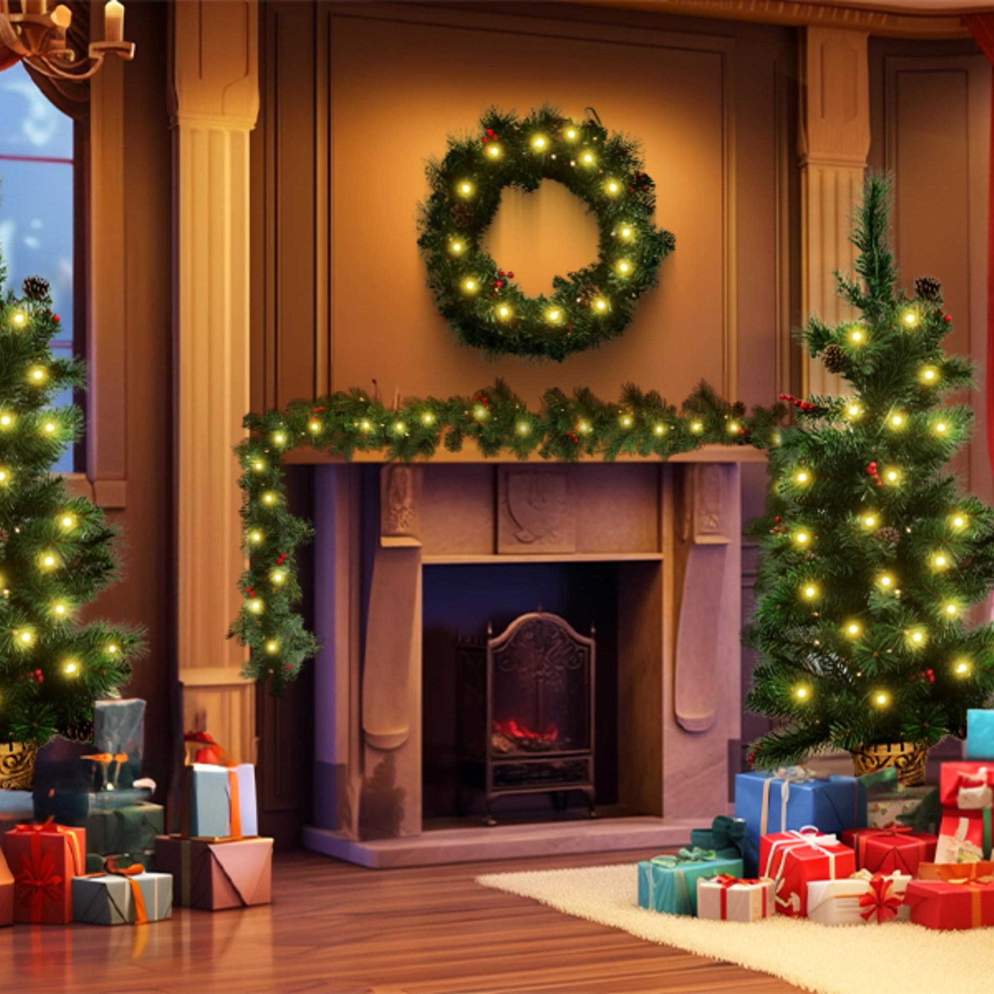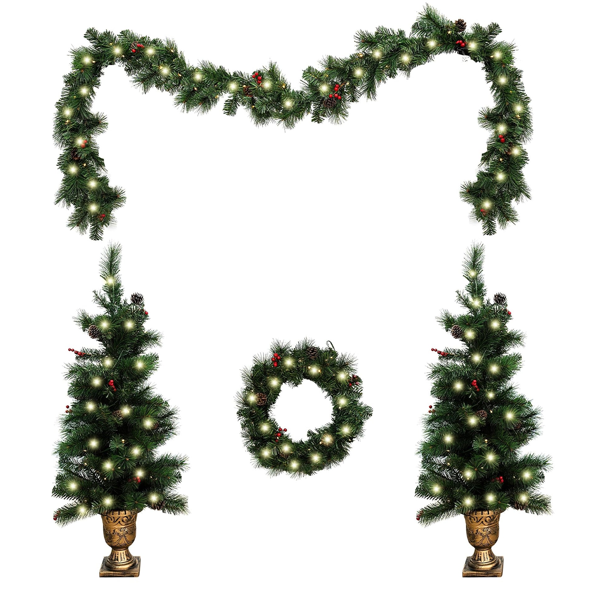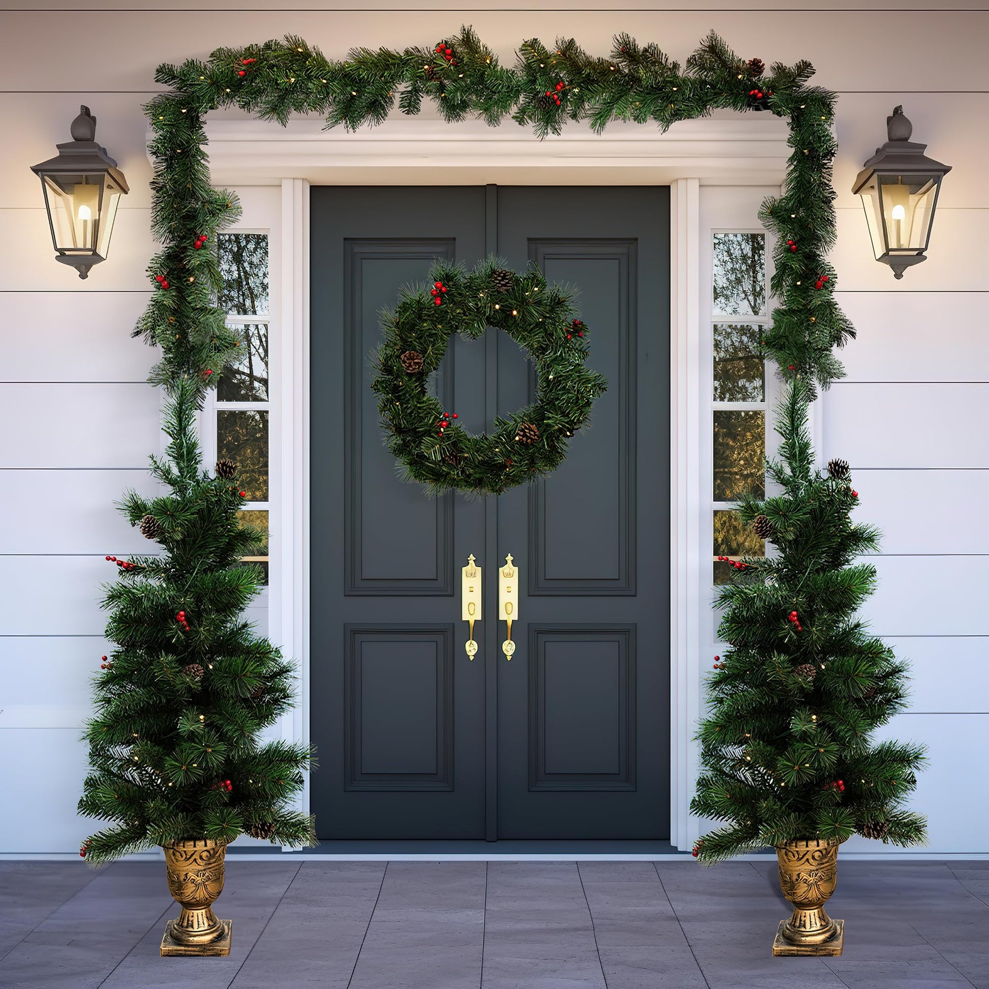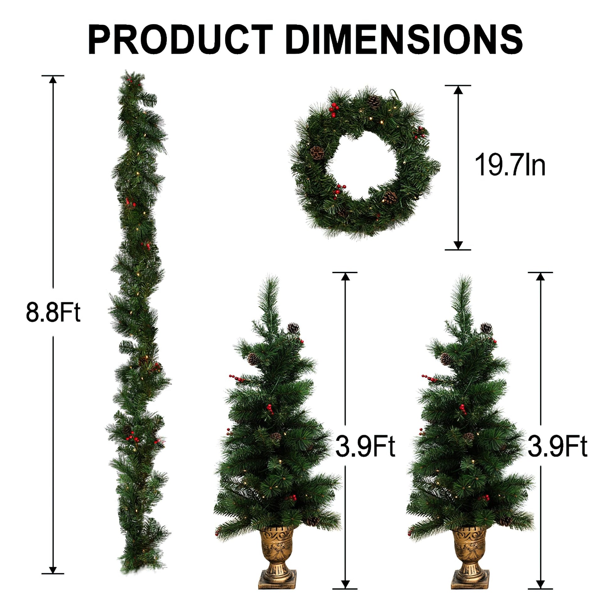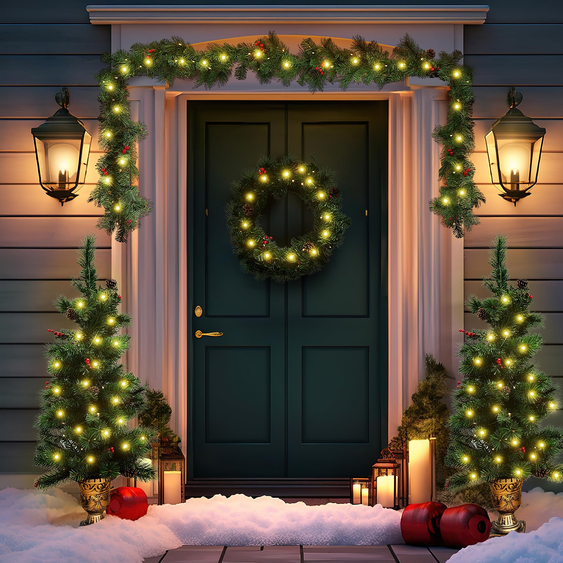 - 🎄【Full of Christmas Vibe】: This Christmas 4-piece set combine of 2 artificial entrance trees, wreath and garland, is a best decoration for home, office, store and school. The strong festive atmosphere and festive cheer created by the vivid green leaves and warm bright LED lights can make you have unforgettable memories during the Christmas season.