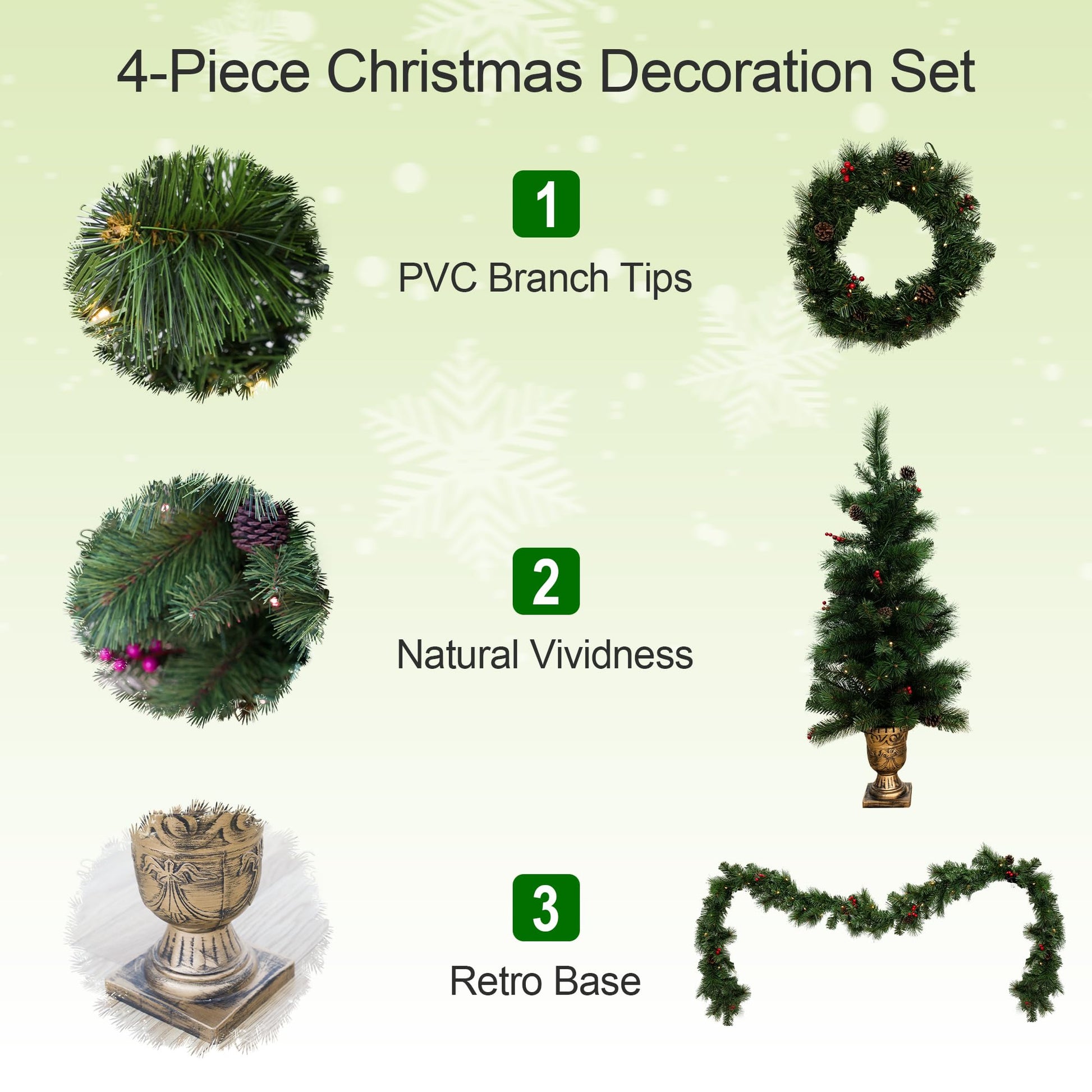 - 🎄【Pre-lit Holiday Christmas 4-piece set】: Our Christmas set includes a 24” wreath, a 9ft garland and two 4ft entrance trees. The holiday set also has verdant leaves and red berry clusters, very vivid and natural, without any assembly steps, you just need to spread out the branches and leaves and load the batteries, turning on the light, you can get a charming Christmas set perfectly decorate your home, which can add joyful touch to corners during the holidays.