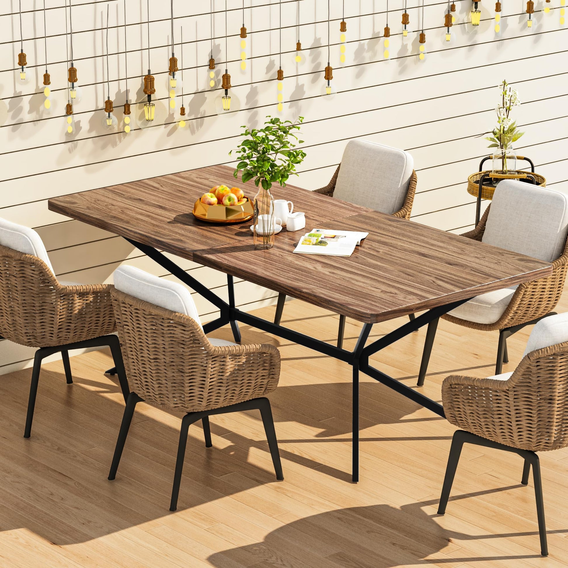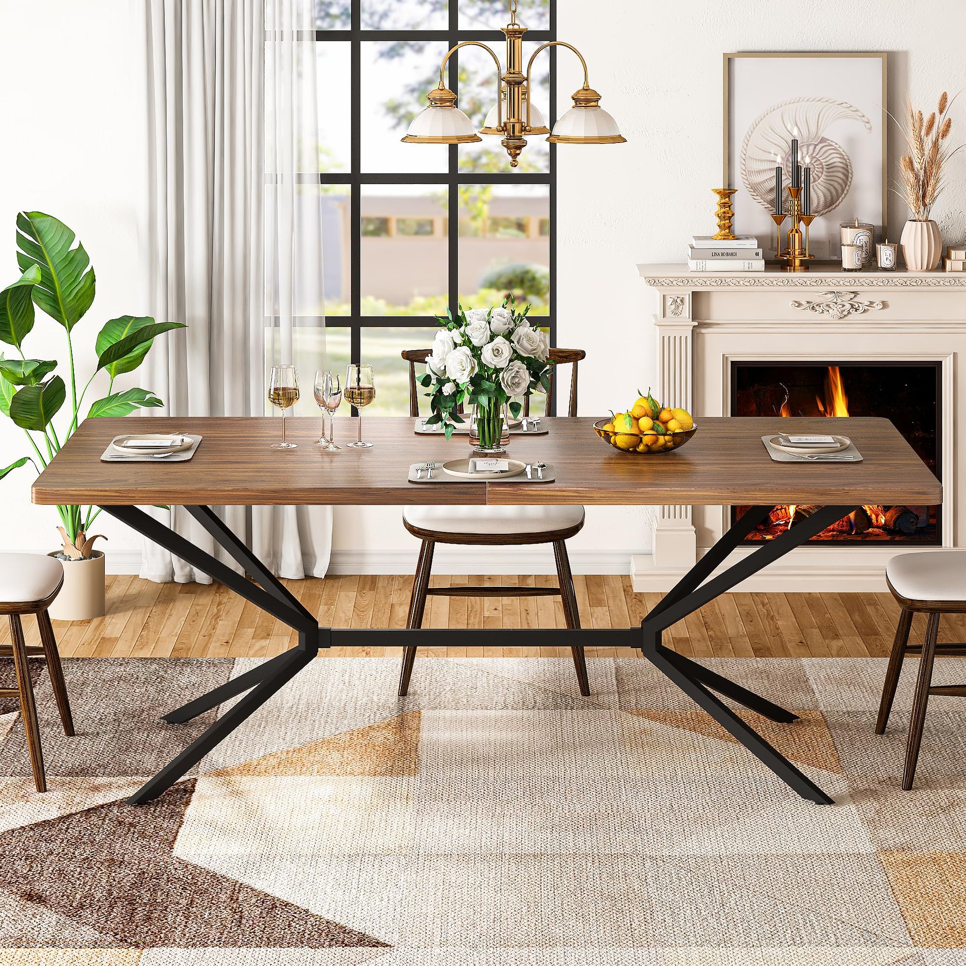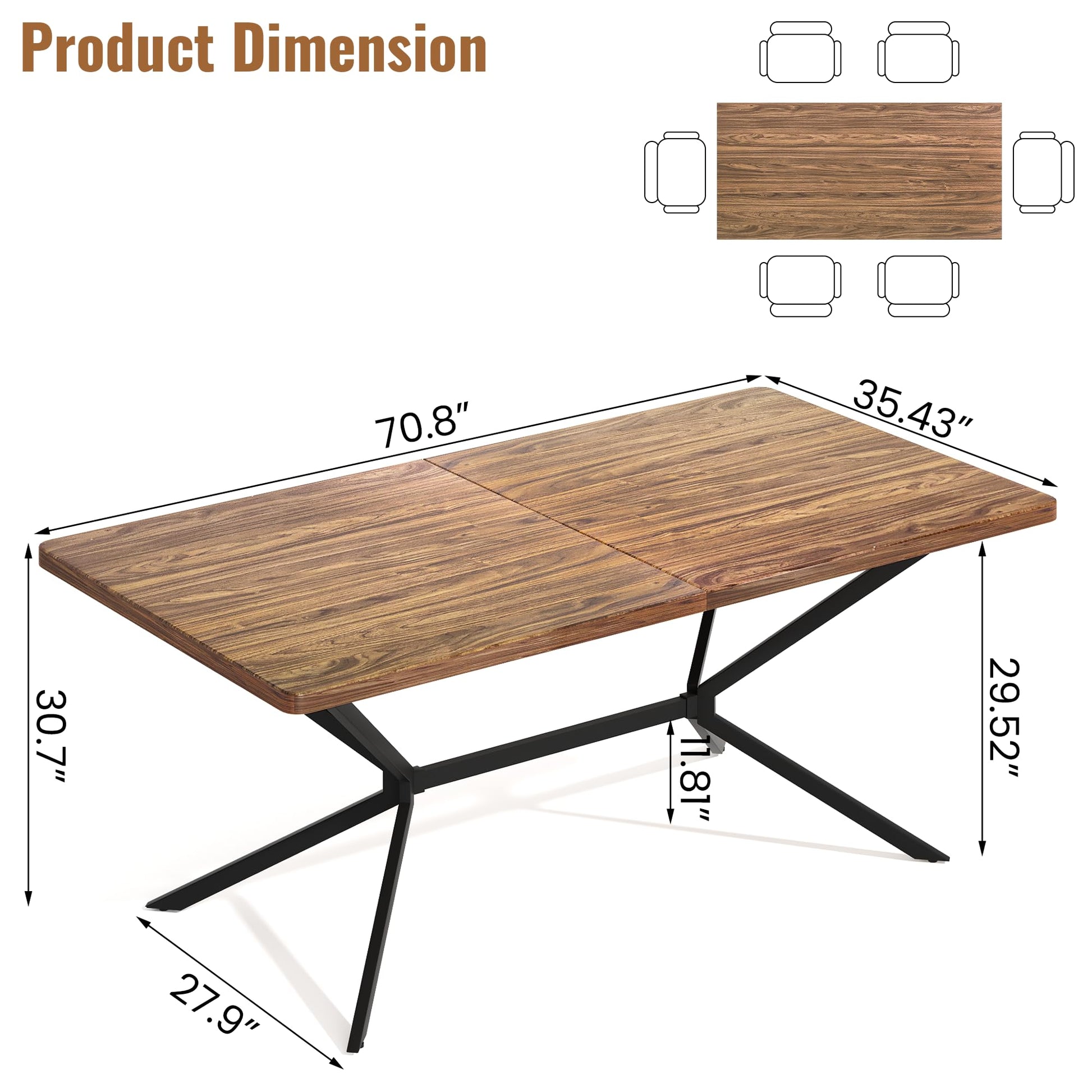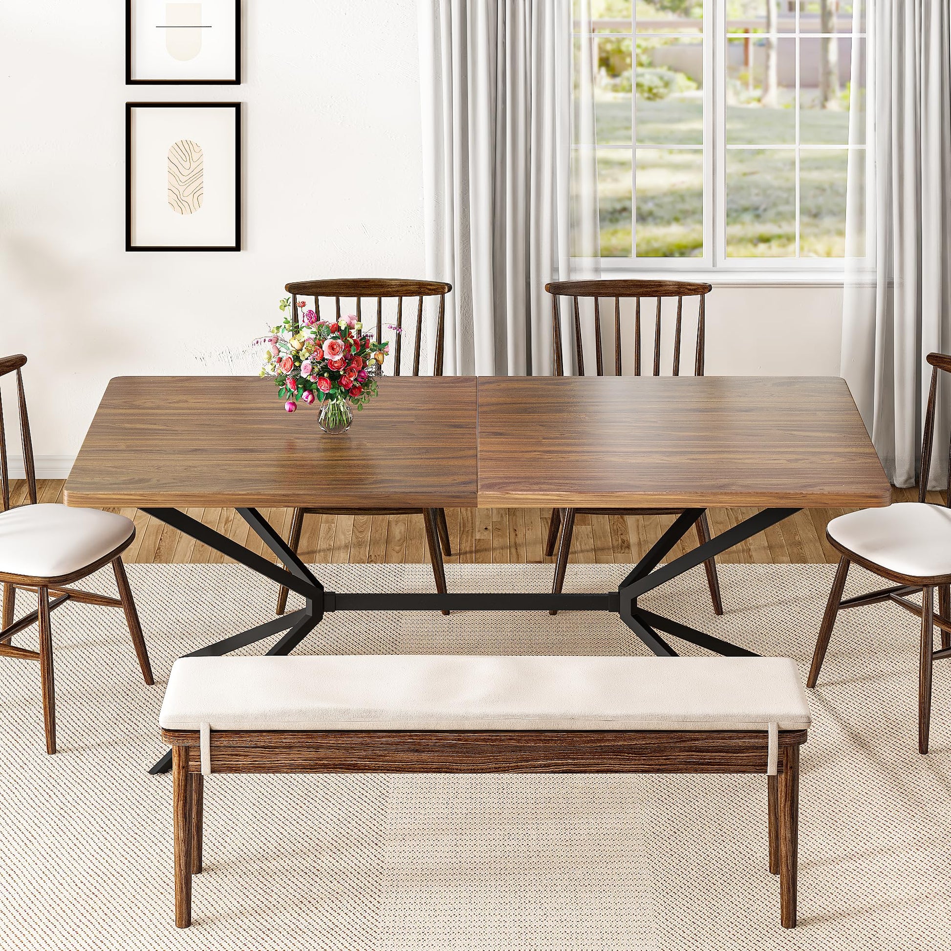【Sturdy Construction】 Crafted with a high-quality engineered wood tabletop featuring a rusitc brown woodgrain finish, supported by a robust X-metal base. This dining table is stable and can support up to 250 lbs, perfect for family gatherings.