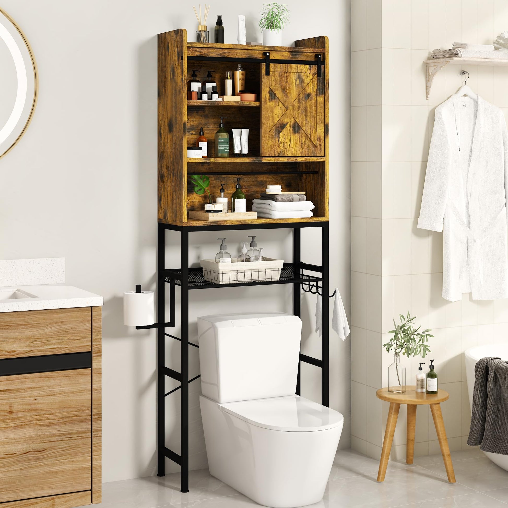 - 【Maximize Bathroom Storage】AWQM Over The Toilet Storage Cabinet adds essential storage above your toilet, optimizing space with 4 open shelves, a storage cabinet, toilet paper holder, and hooks for versatile organization. Ideal for toiletries, towels, and decor like candles or succulents.