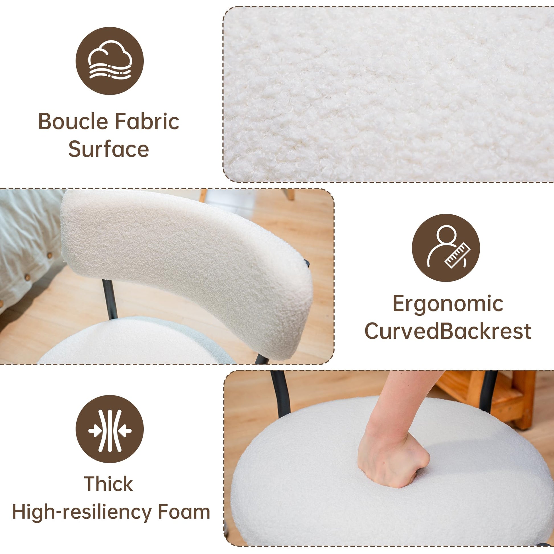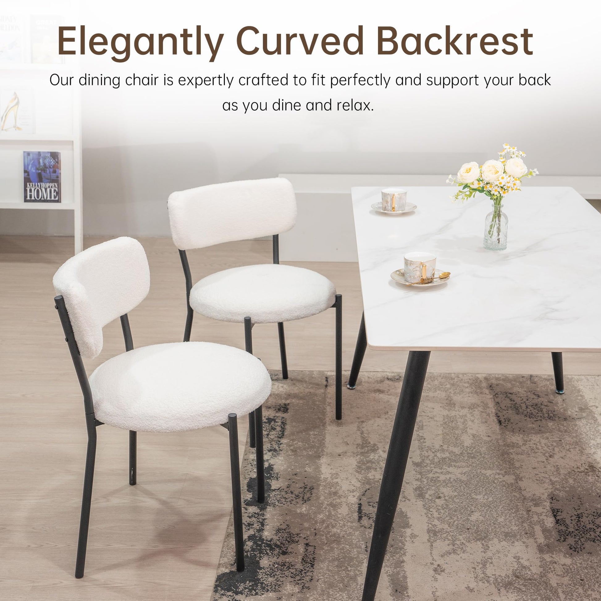【Upholstered Dining Chair】Our dining chairs set is made of boucle fabric which is fluffy, warm, comfortable, high elasticity and not easy to shed. The dining chair combination with white seat cushion and black metal frame design is very perfect for your kitchen, dining room, living room, meeting room and bedroom.