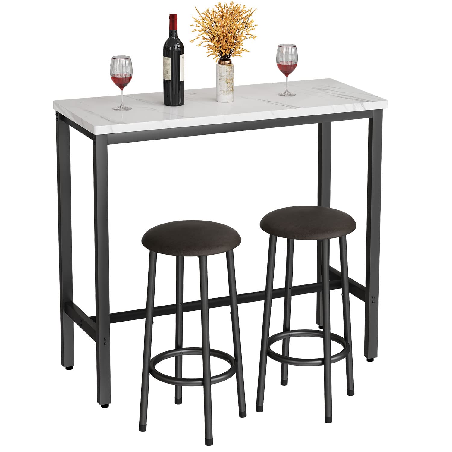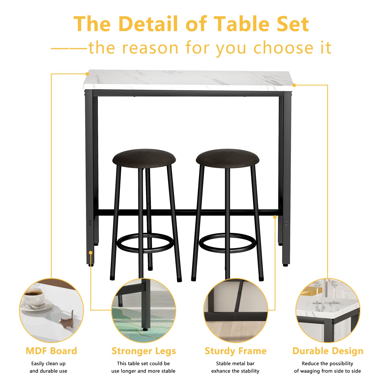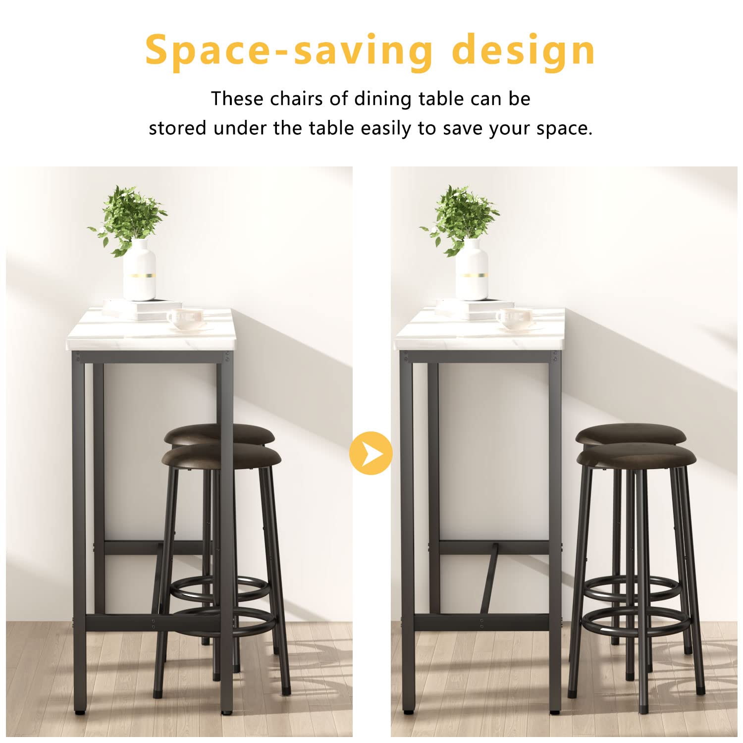 The smooth marble pattern tabletop is easy to clean, and the durable metal legs ensure it is sturdy and durable. The stools come with soft cushions and high-quality leather, providing a comfortable seating experience.