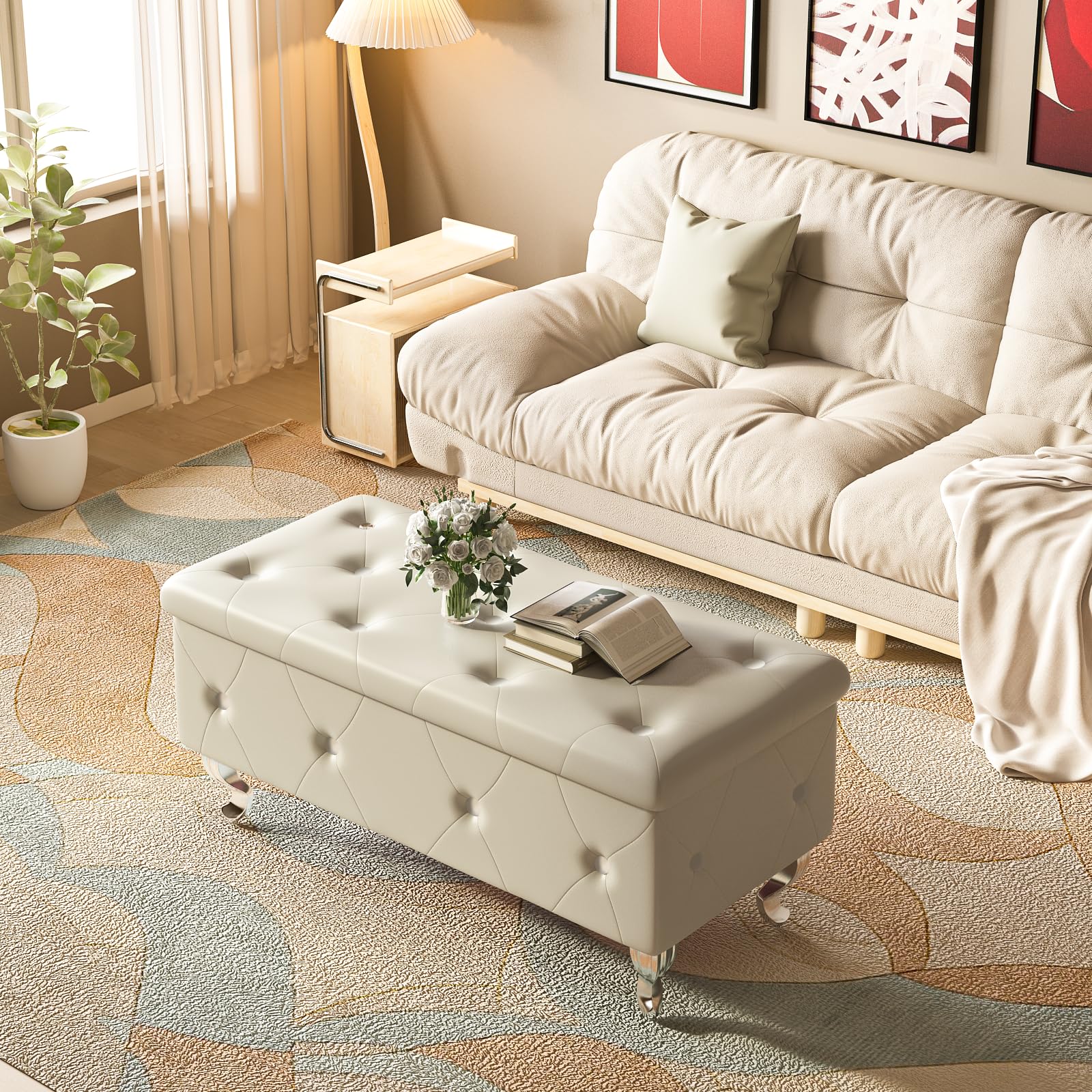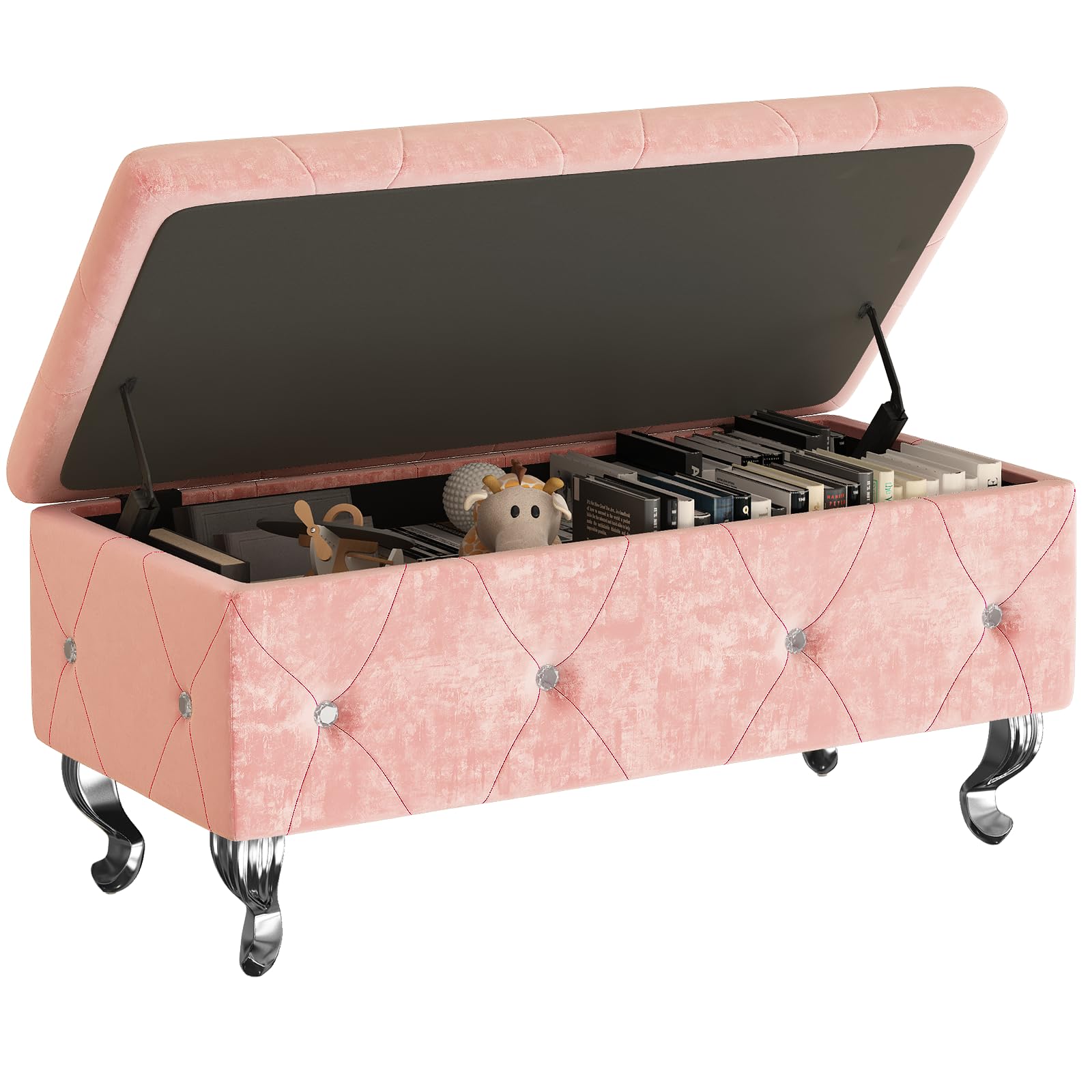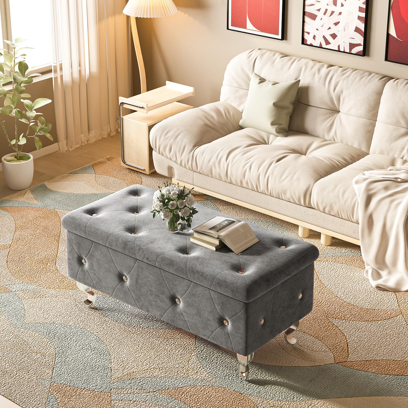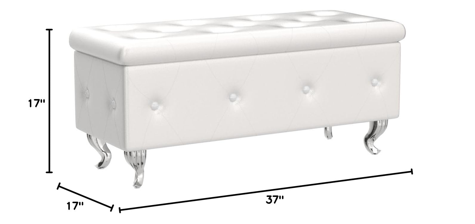 The crystal buckles and neat stitching on the tufted fabric cover give this storage ottoman a sophisticated and luxurious look anywhere in the home, enhancing its modern design.