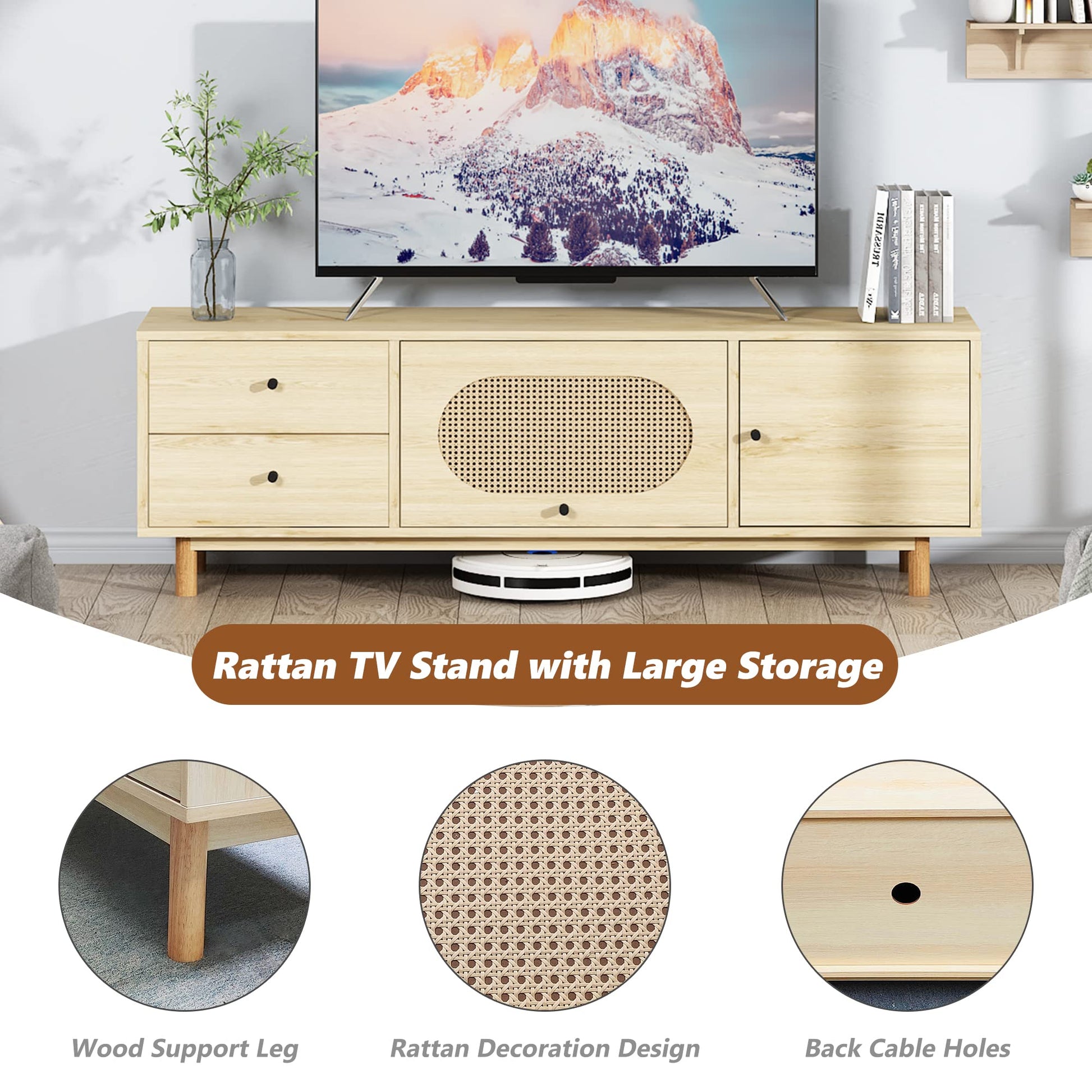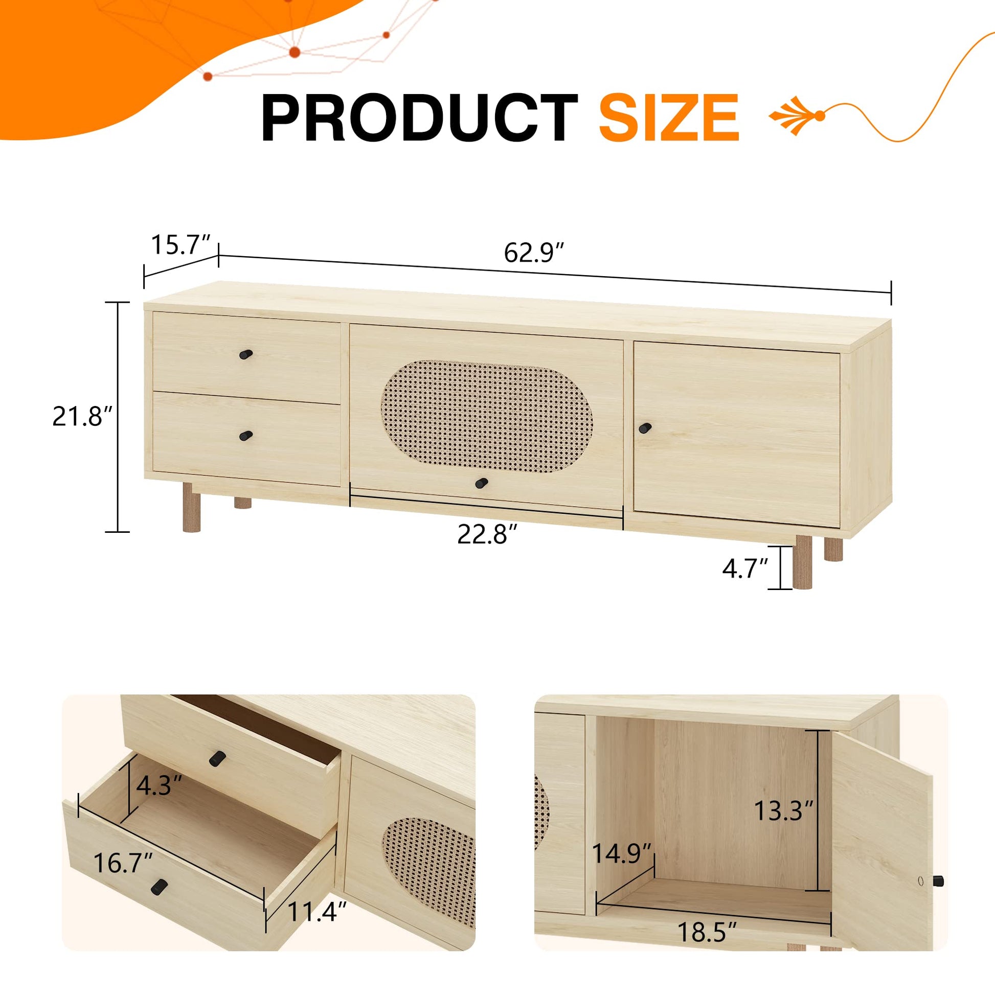 - 【Ample Storage Space】This rattan TV Console is with a 63" length tabletop and suits flat screens up to 70" and some decorations. The 2 Drawers and 2 cabinet are ideal for placing DVD players, speakers, set-top boxes, and other media or gaming devices, and can keep your living room organized and clutter-free.