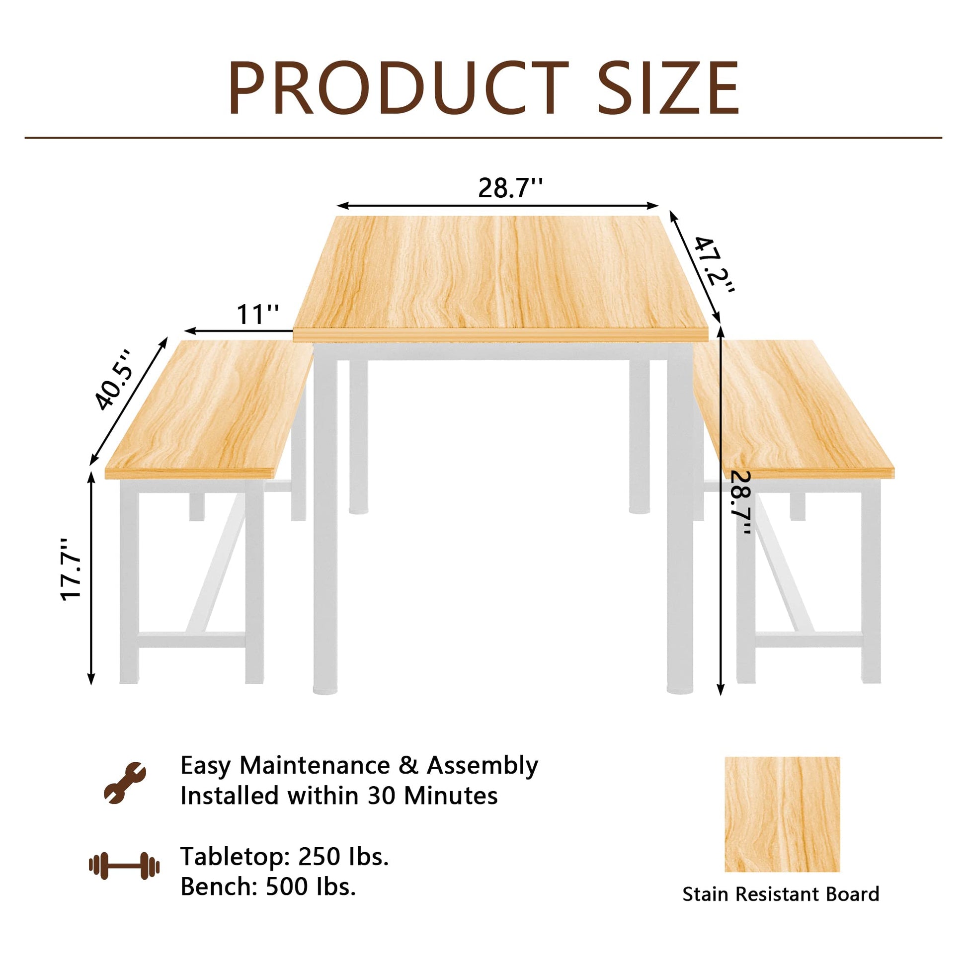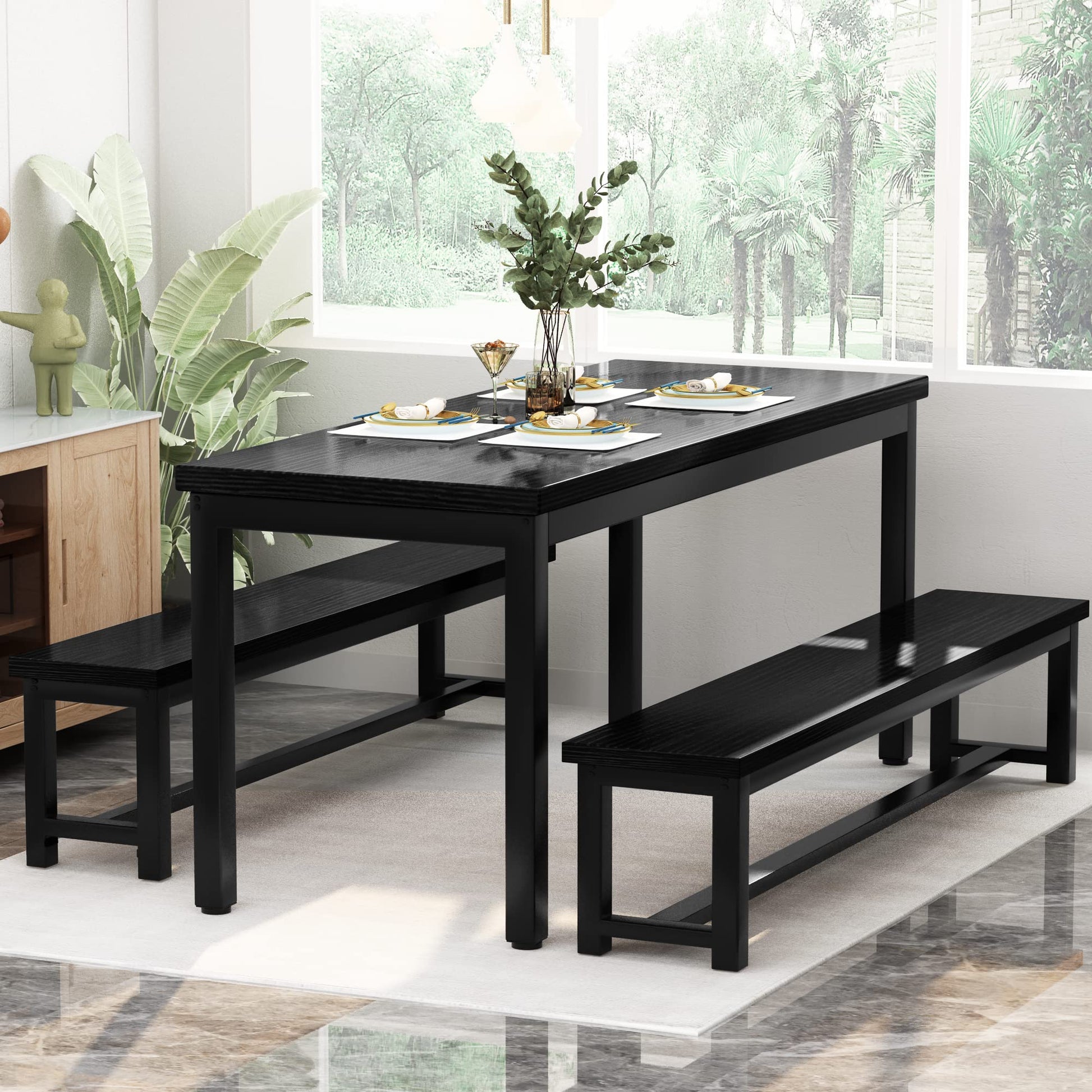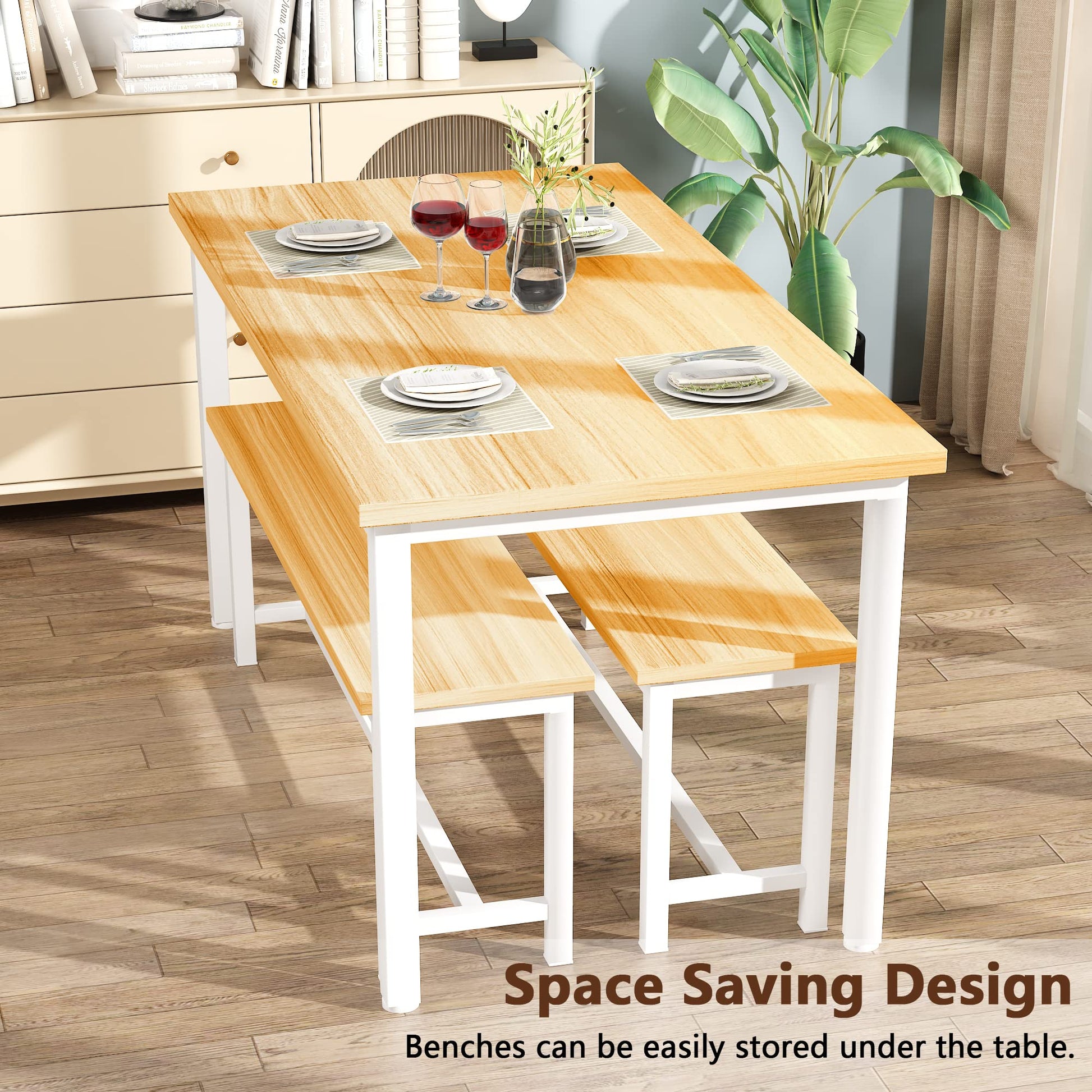 Both benches can be conveniently tucked under the table, when not in use, these benches are space-saving and convenient. It can help to prepare and deliver delicious food to the kitchen tabletop conveniently, avoiding accidental tripping.