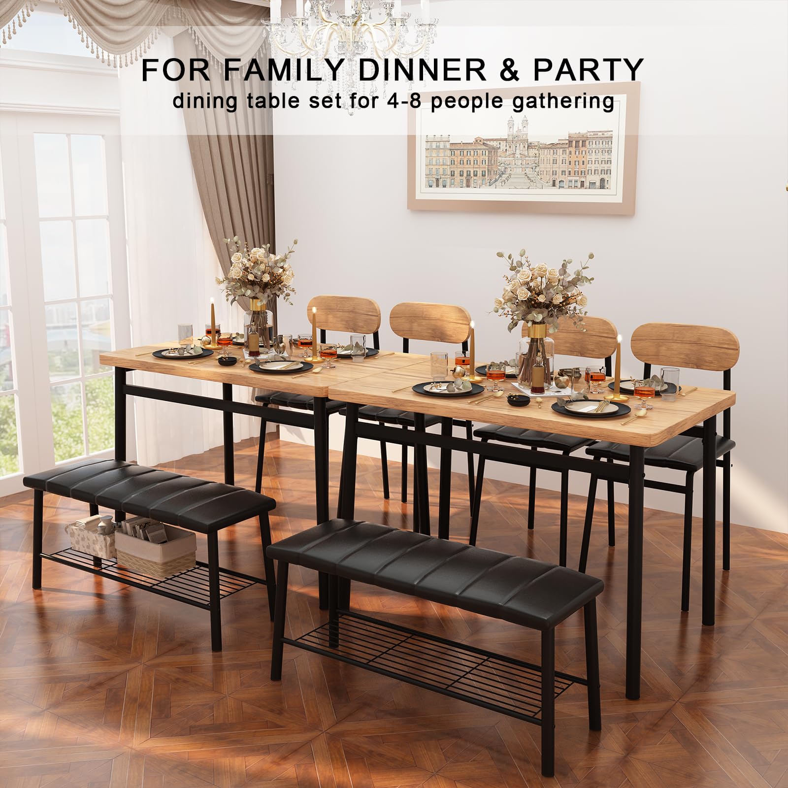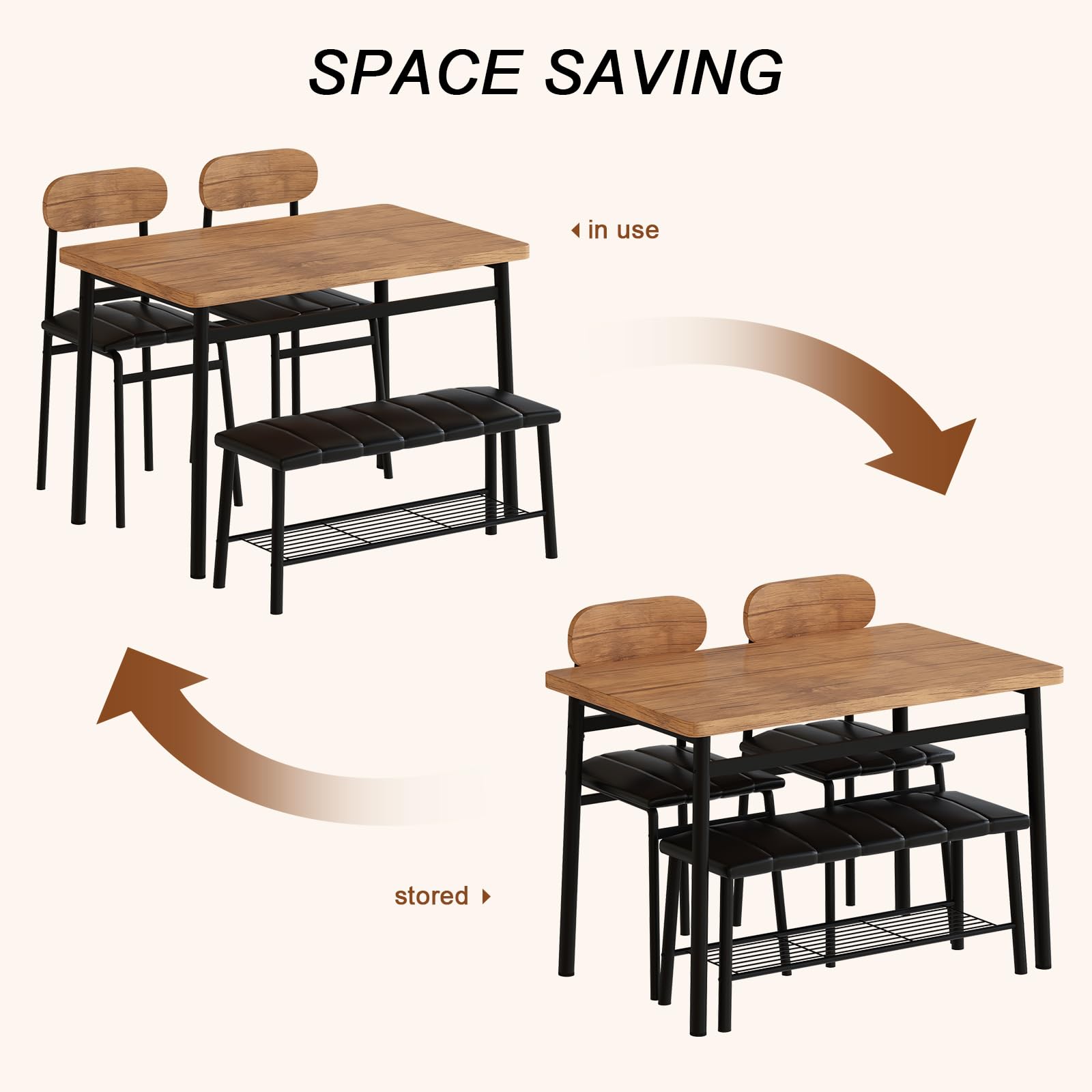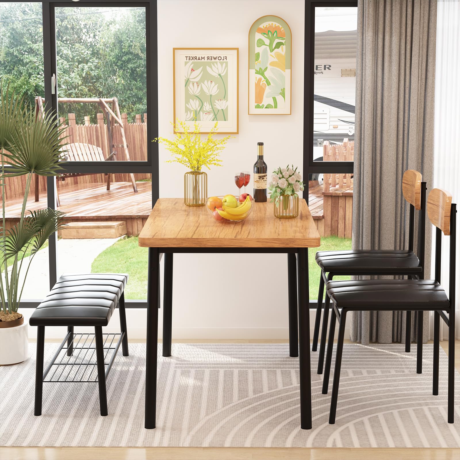 - 【Modern Industrial Dining Table Set】: Our 4-person dining table set includes 1spacious dining table, 2 upholstered chairs, and 1 Upholstered bench.Enjoy the classic wood grain tabletop, simple lines and industrial black legs combined together, which make this simple dining furniture easily matches any color scheme and home decoration.