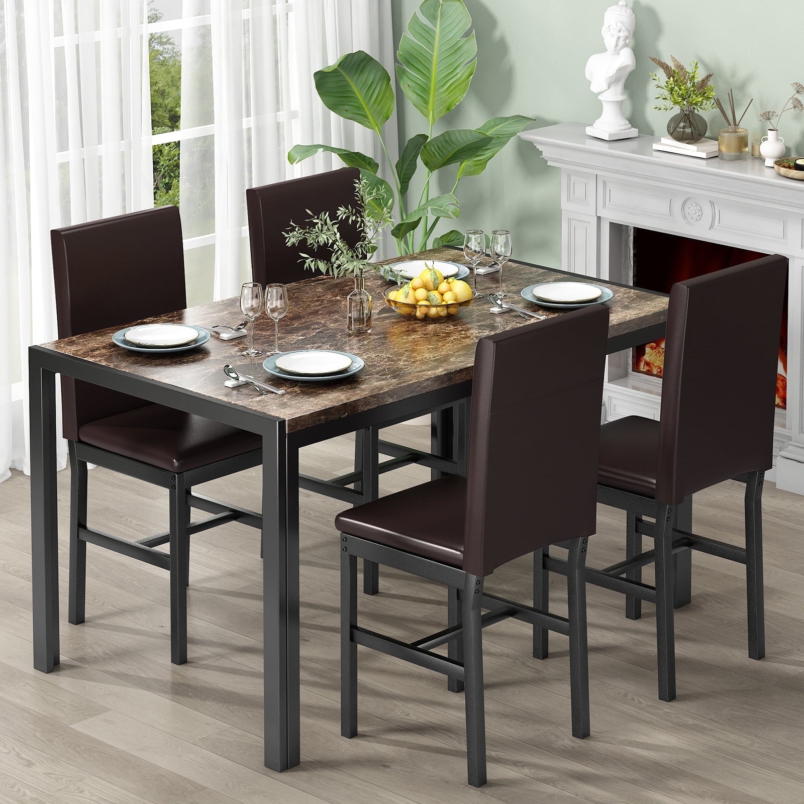 AWQM Dining table set for 4 with modern faux marble table top and 4 PU leather upholstered chairs, compact space saving dining table for apartment, kitchen, dining room, breakfast corner, brown