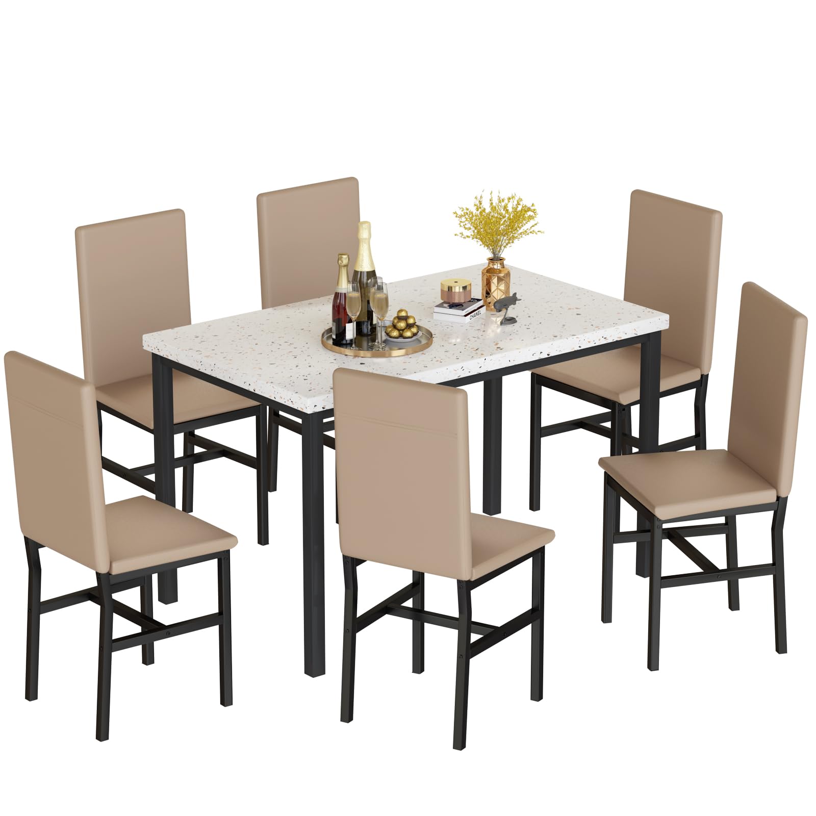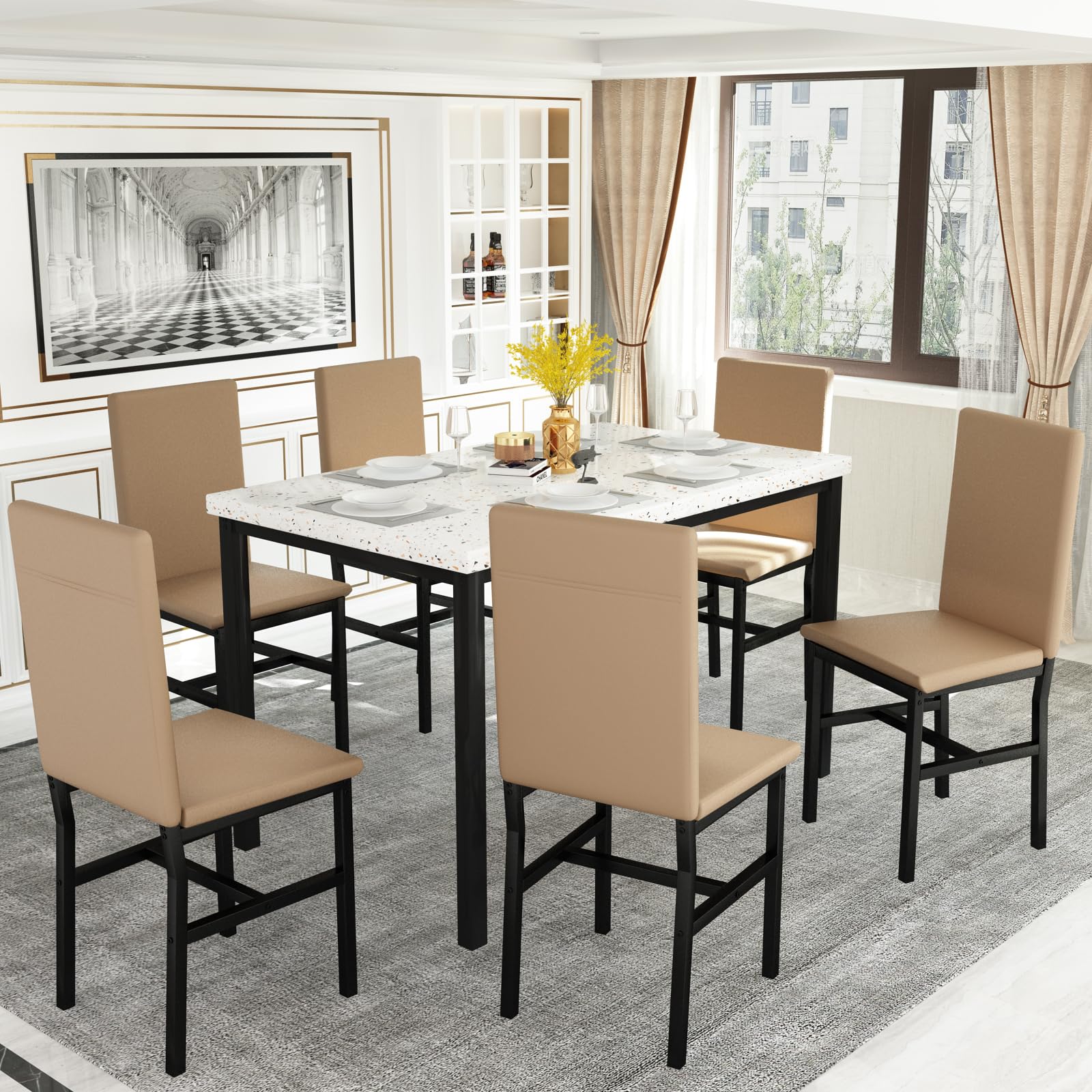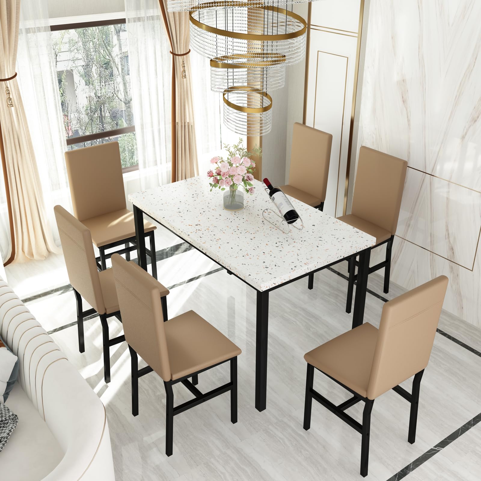 AWQM Marble 6-person dining table set with 6 PU leather chairs