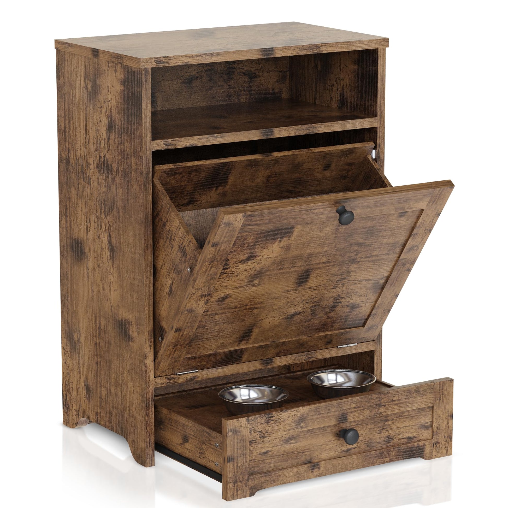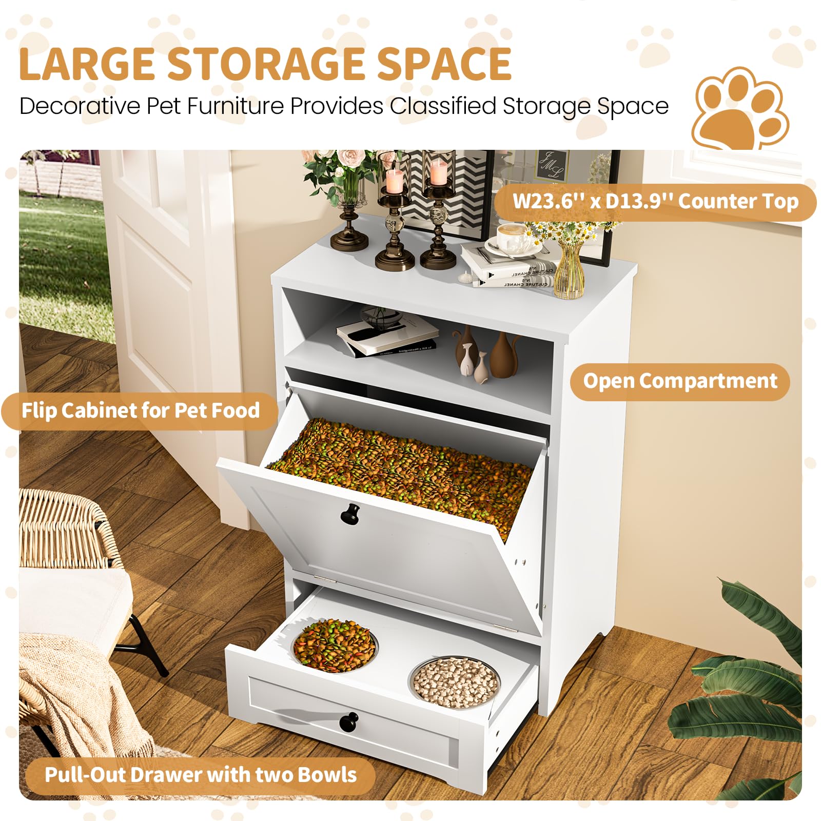- PET FEEDER STATION: The dog feeder station consists of a wide countertop, open compartments, a pull-out dog food storage container, and a drawer with two removable stainless steel dog bowls. Entire dog food storage cabinet size: 24'' Wx 14''D x 32.5''H