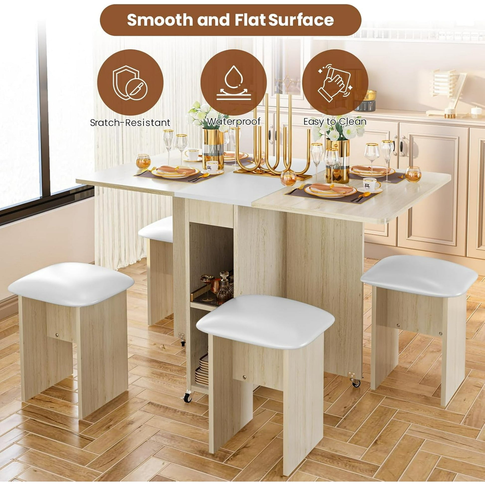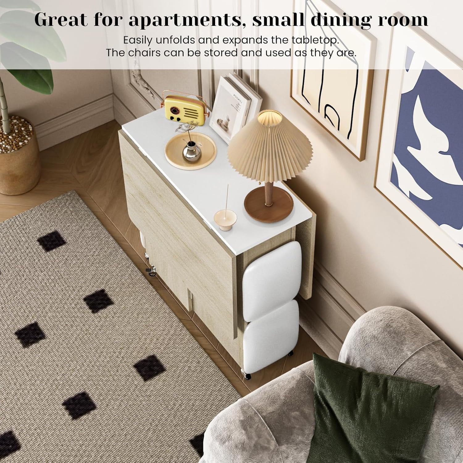 AWQM Folding Dining Table Set for 4, Dinner Table with 4 Leather Chairs and Shelves, Space Saving Foldable Dining Table with 6 Wheels, Kitchen Table Set for Small Spaces (Off-White)