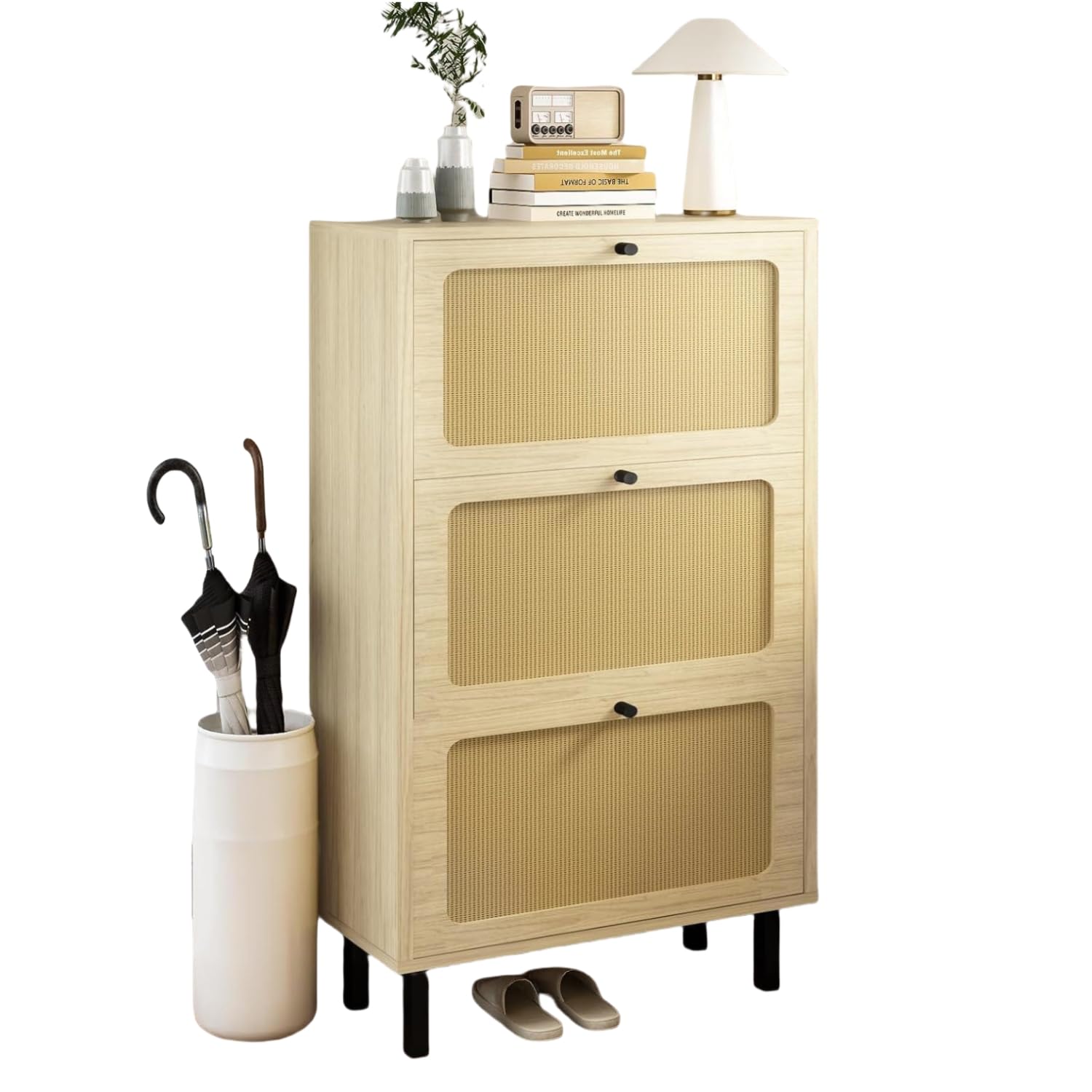 AWQM Freestanding shoe cabinet with 3 rattan flip-up drawers