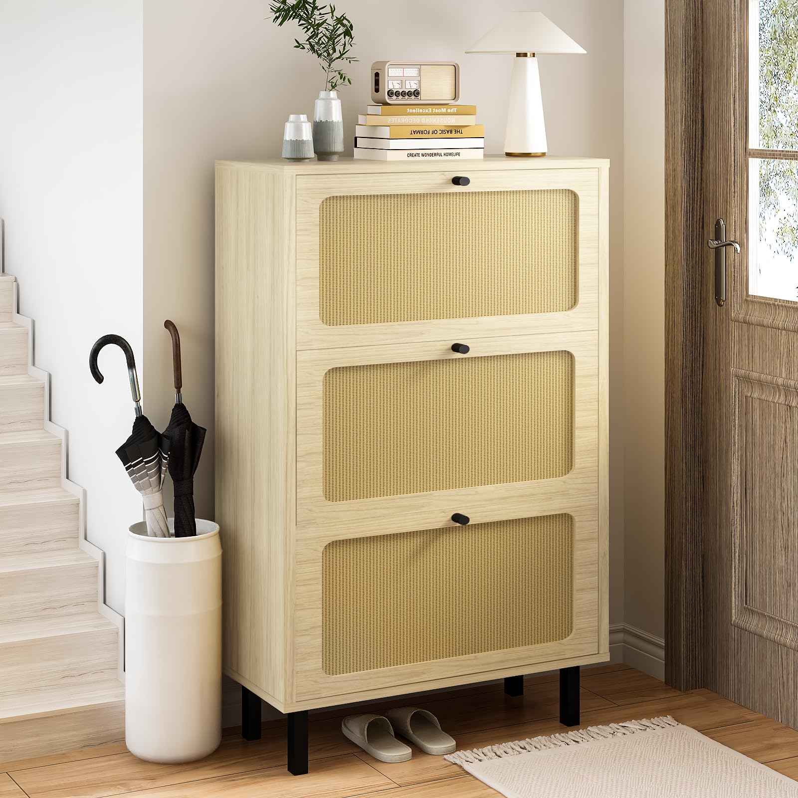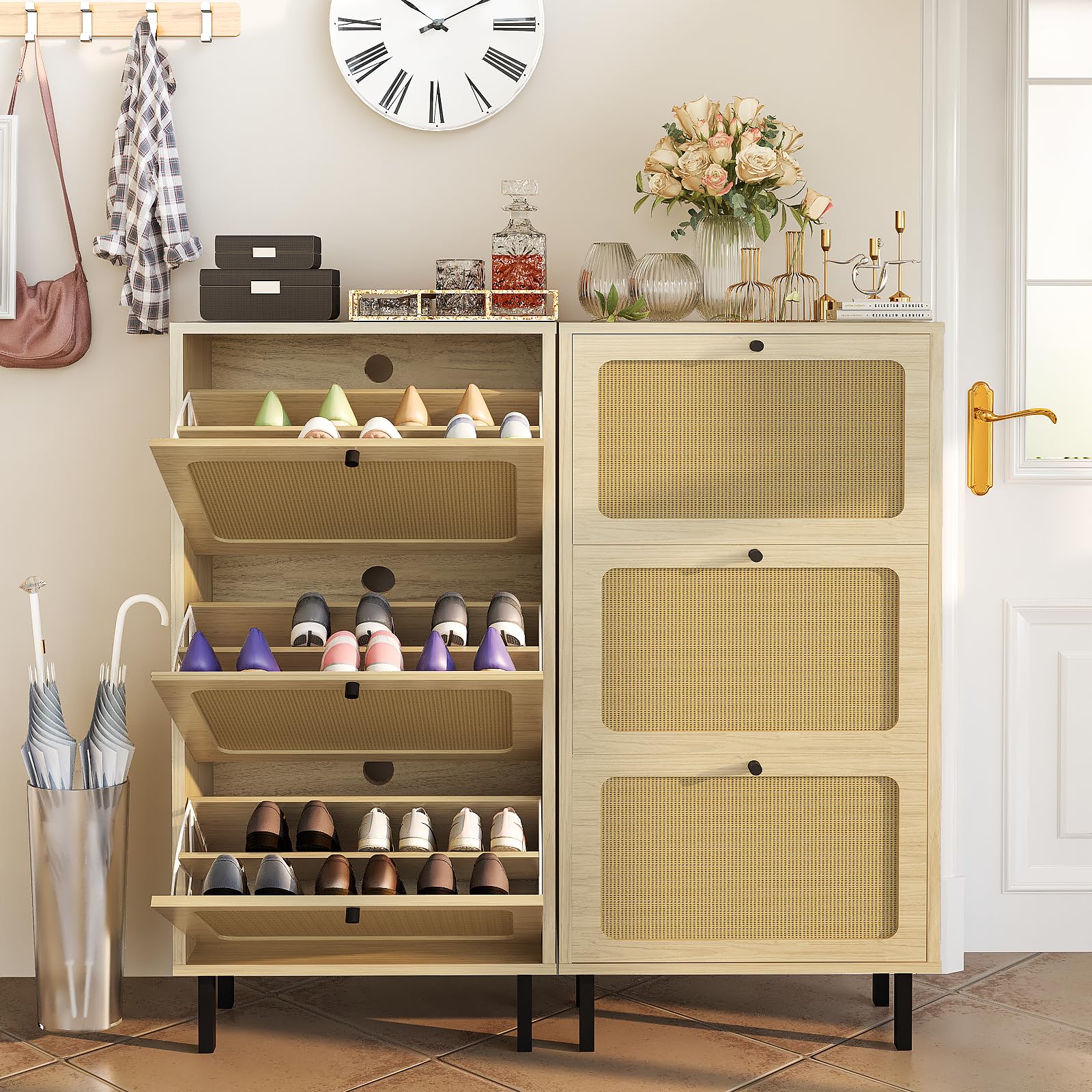 - FLIP DRAWER SHOE CABINET: This shoe organizer is made of hand-woven natural rattan and high-density MDF material. This rattan shoe cabinet contains 3 flip drawers, each drawer has 2 compartments, can hold 5-6 pairs of shoes, Holds up to 18 pairs shoes