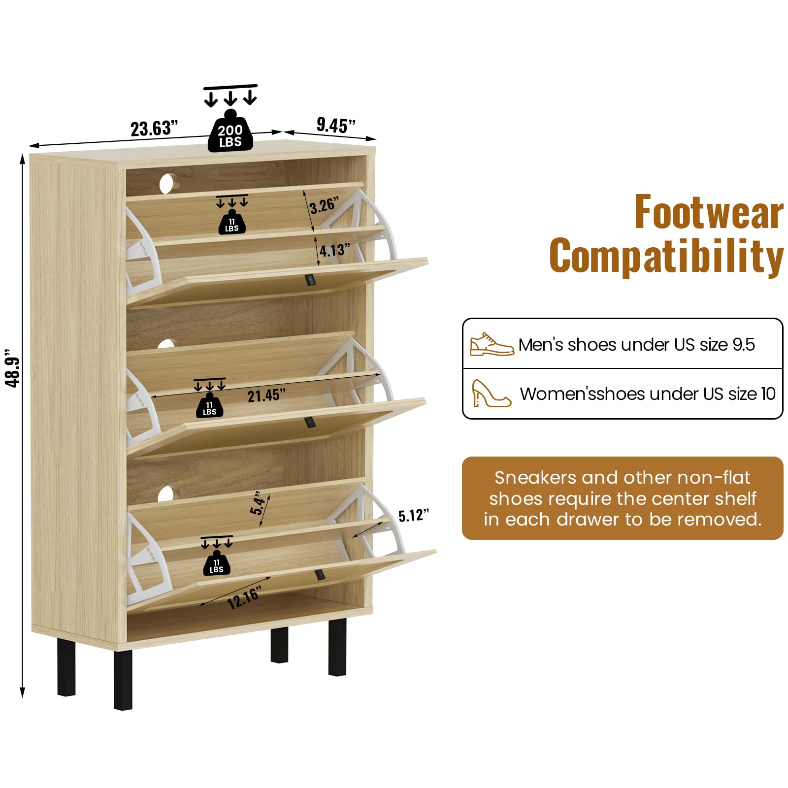 FLIP DRAWER SHOE CABINET: This shoe organizer is made of hand-woven natural rattan and high-density MDF material. This rattan shoe cabinet contains 3 flip drawers, each drawer has 2 compartments, can hold 5-6 pairs of shoes, Holds up to 18 pairs shoes