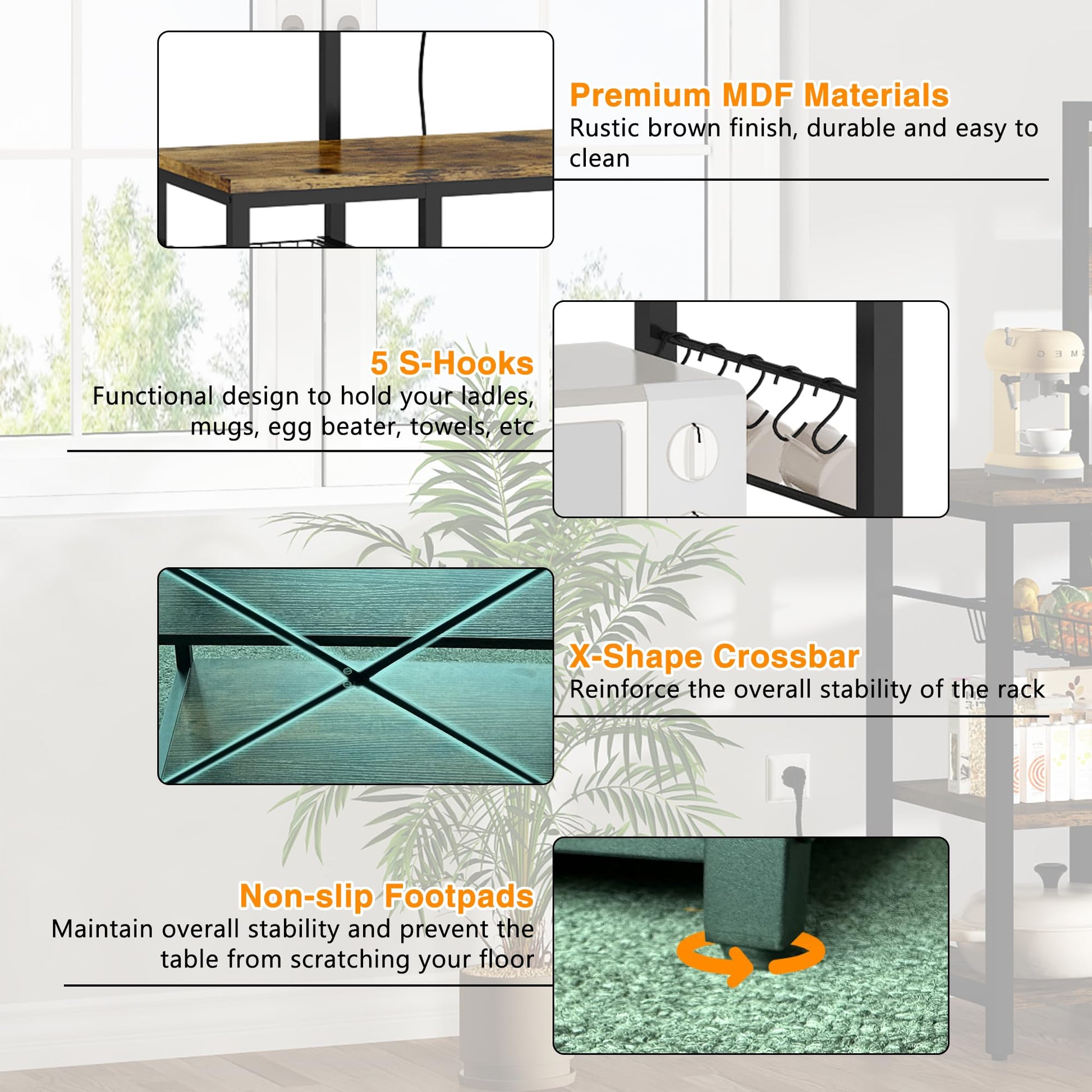 The kitchen baker rack is made of reinforced metal frame and high-quality MDF, which ensures the kitchen shelf has a large load-bearing capacity and remains stable. The coffee bar organizer's stable structure adopts X-shaped crossbars for excellent stability and durability. The kitchen shelf with staggered shelves adds more storage space for oven microwave, coffee machine, toaster and provides ample space for your daily storage options.