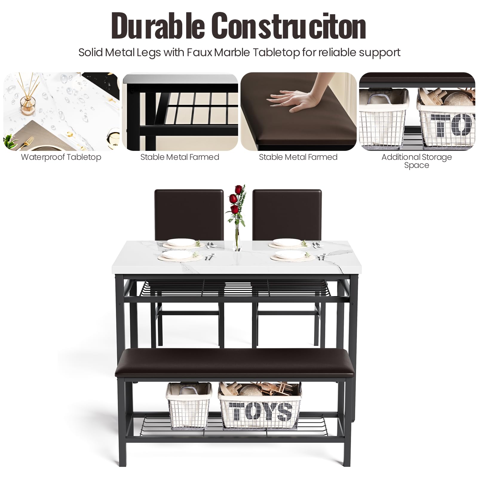 This kitchen dining table set is made of heavy-duty metal and thick artificial marble slabs to ensure high stability, the surface is very smooth to the touch, easy to clean and rust-proof, the chairs and benches are made of soft cushions and durable PU leather for a comfortable seating experience!