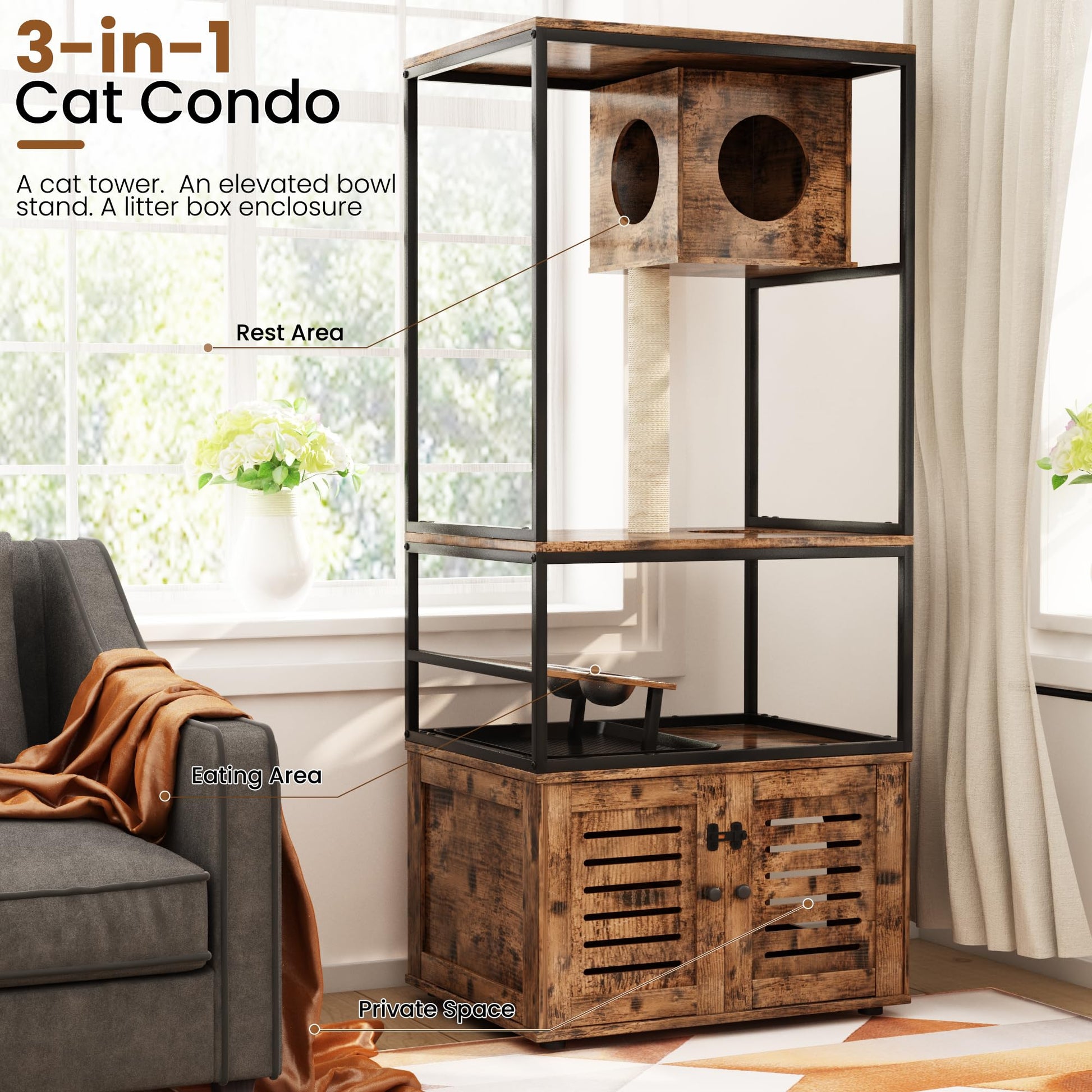 The 3-in-1 cat house provides your cat with an all-in-one place to play, relax, eat and sleep, cats can play and relax in the upper and lower spaces, which is large enough to accommodate most cats; in order to satisfy your cute cat's climbing nature, it can not only scratch its claws on the natural sisal rope, but also jump from one floor to another.