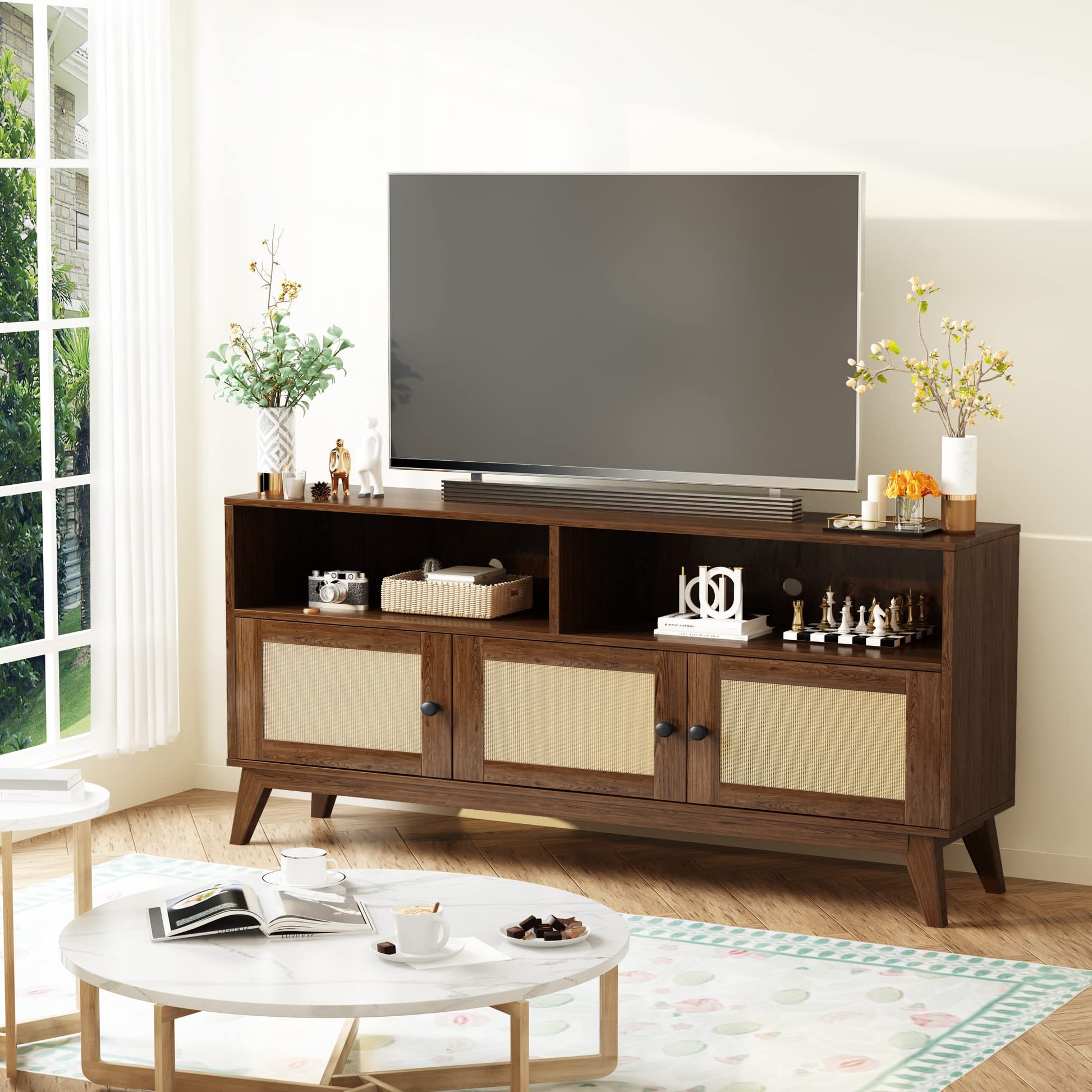 - 【Ample Storage Space】This rattan TV Console is with a 57" length tabletop and suitable for TV from 35" to 65" screen size. The 3 open shelves and 2 cabinet are ideal for placing DVD players, speakers, set-top boxes, and other media or gaming devices, and can keep your living room organized.