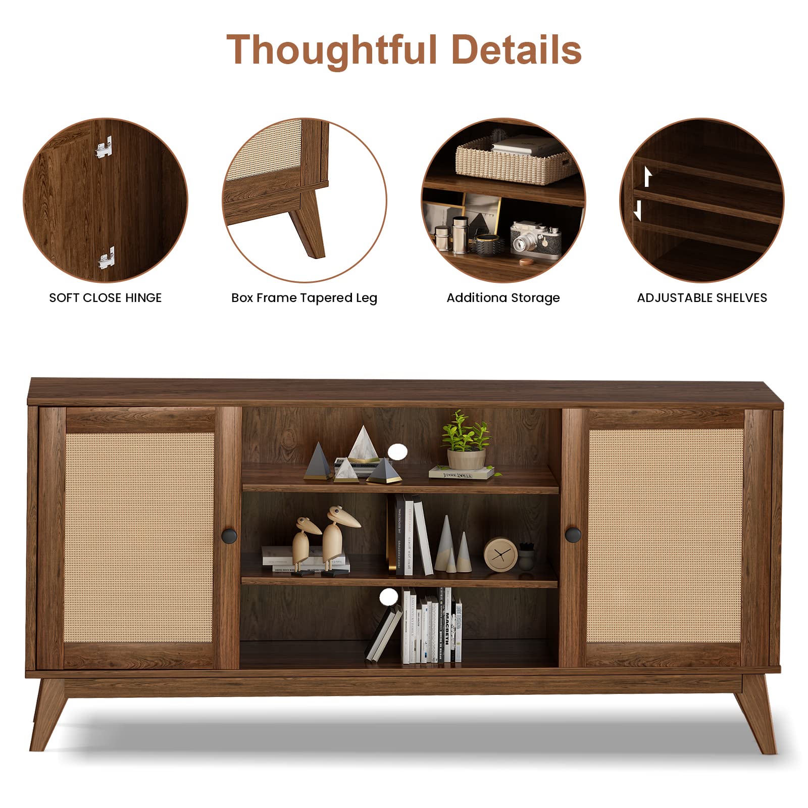 【Ample Storage Space】This rattan TV Console is with a 57" length tabletop and suitable for TV from 35" to 65" screen size. The 3 open shelves and 2 cabinet are ideal for placing DVD players, speakers, set-top boxes, and other media or gaming devices, and can keep your living room organized.
