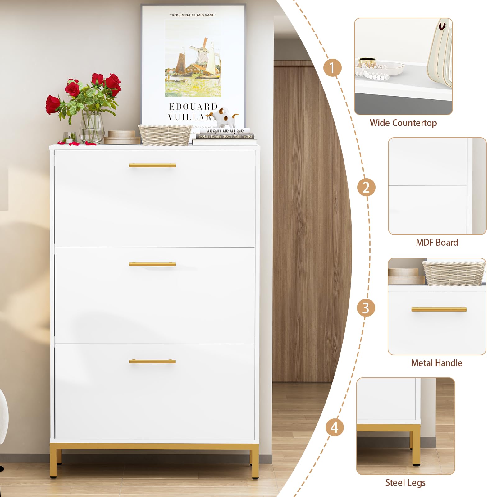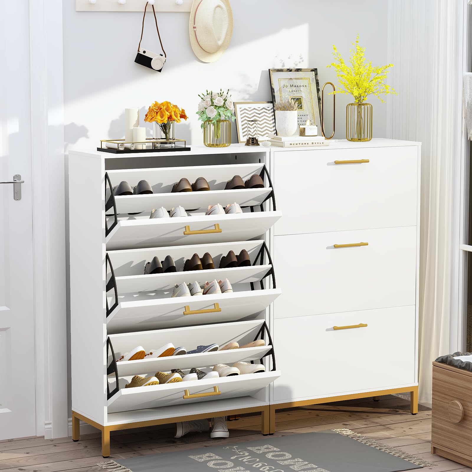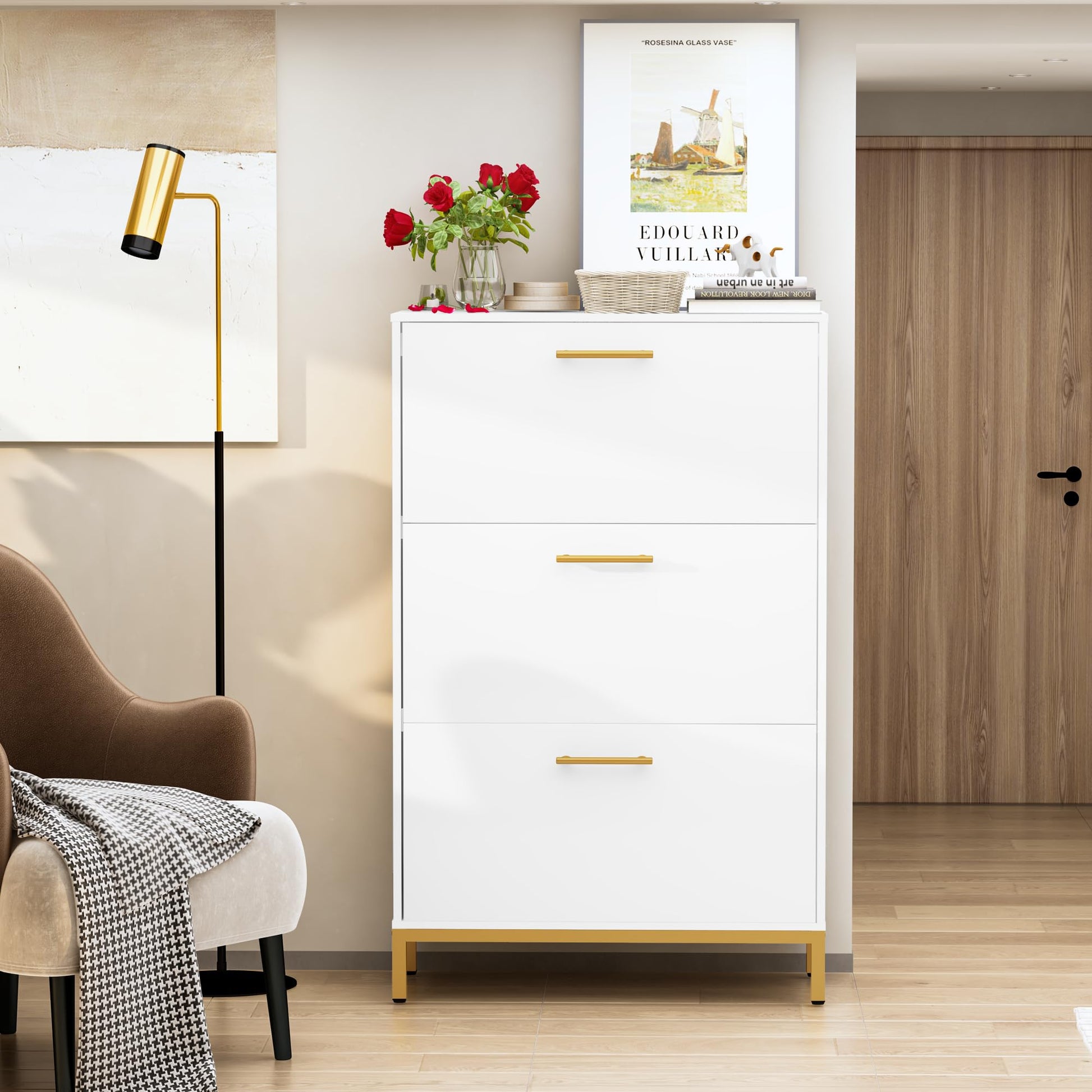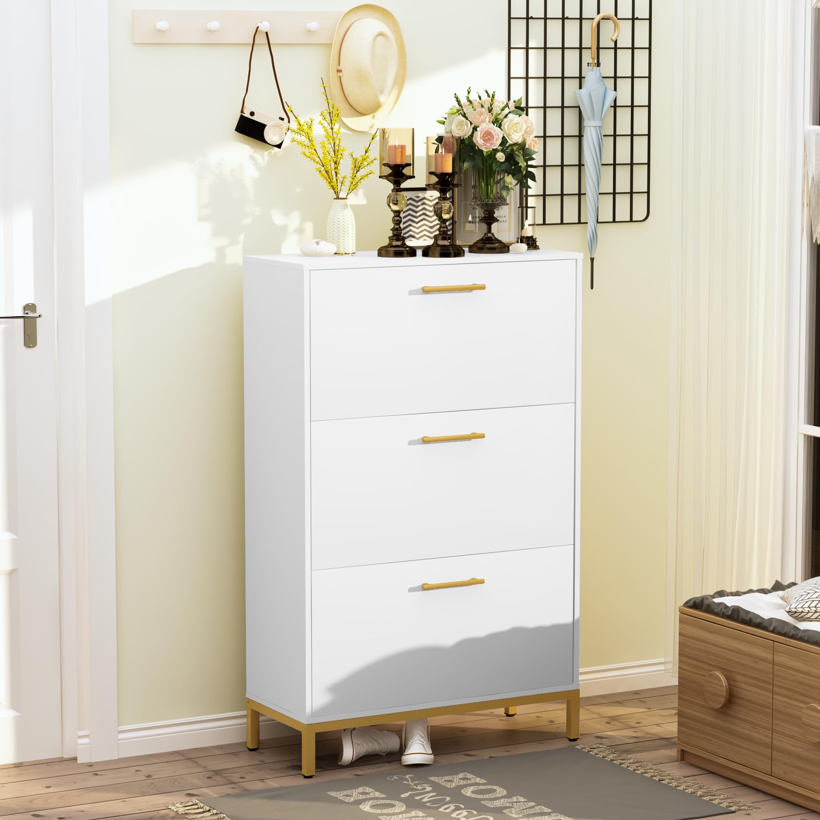 ENTRYWAY SHOE CABINET: The shoe cabinet is made of high-quality MDF and powder-coated metal frame. The two-tone finish shoe racks, the gold metal frame and the white drawers add modern fashion and enhance beauty while providing excellent practicality