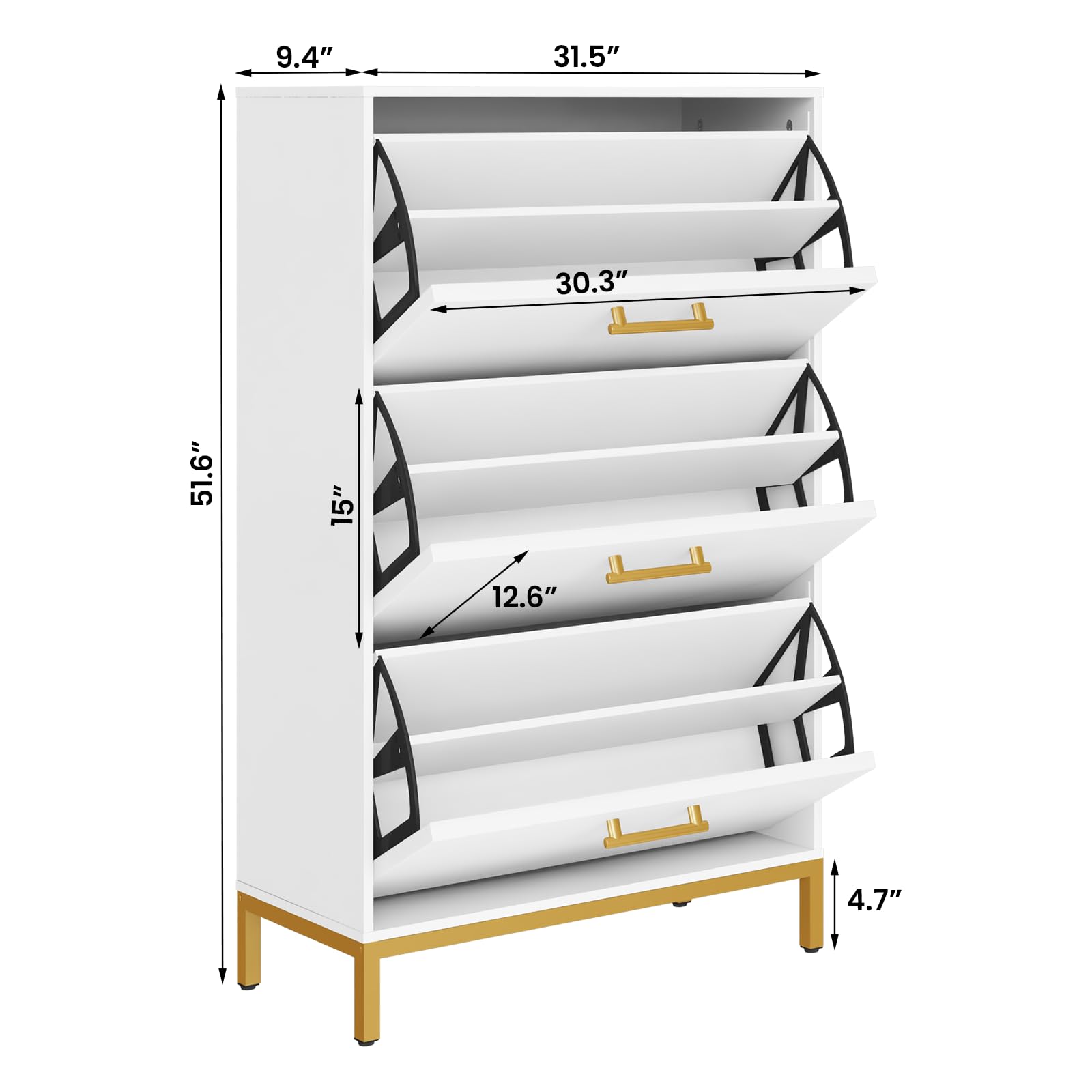 - ENTRYWAY SHOE CABINET: The shoe cabinet is made of high-quality MDF and powder-coated metal frame. The two-tone finish shoe racks, the gold metal frame and the white drawers add modern fashion and enhance beauty while providing excellent practicality