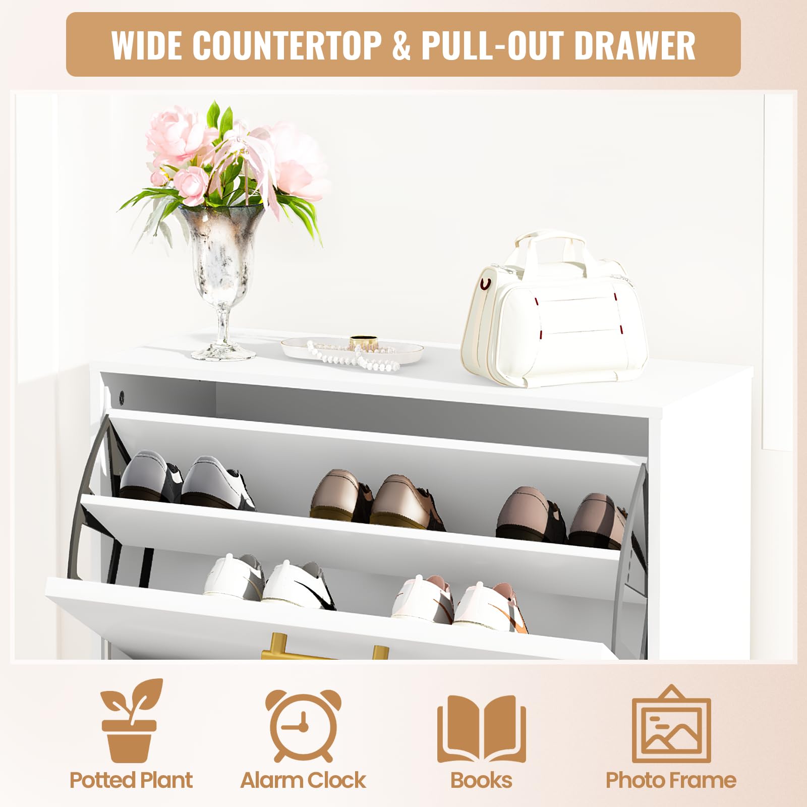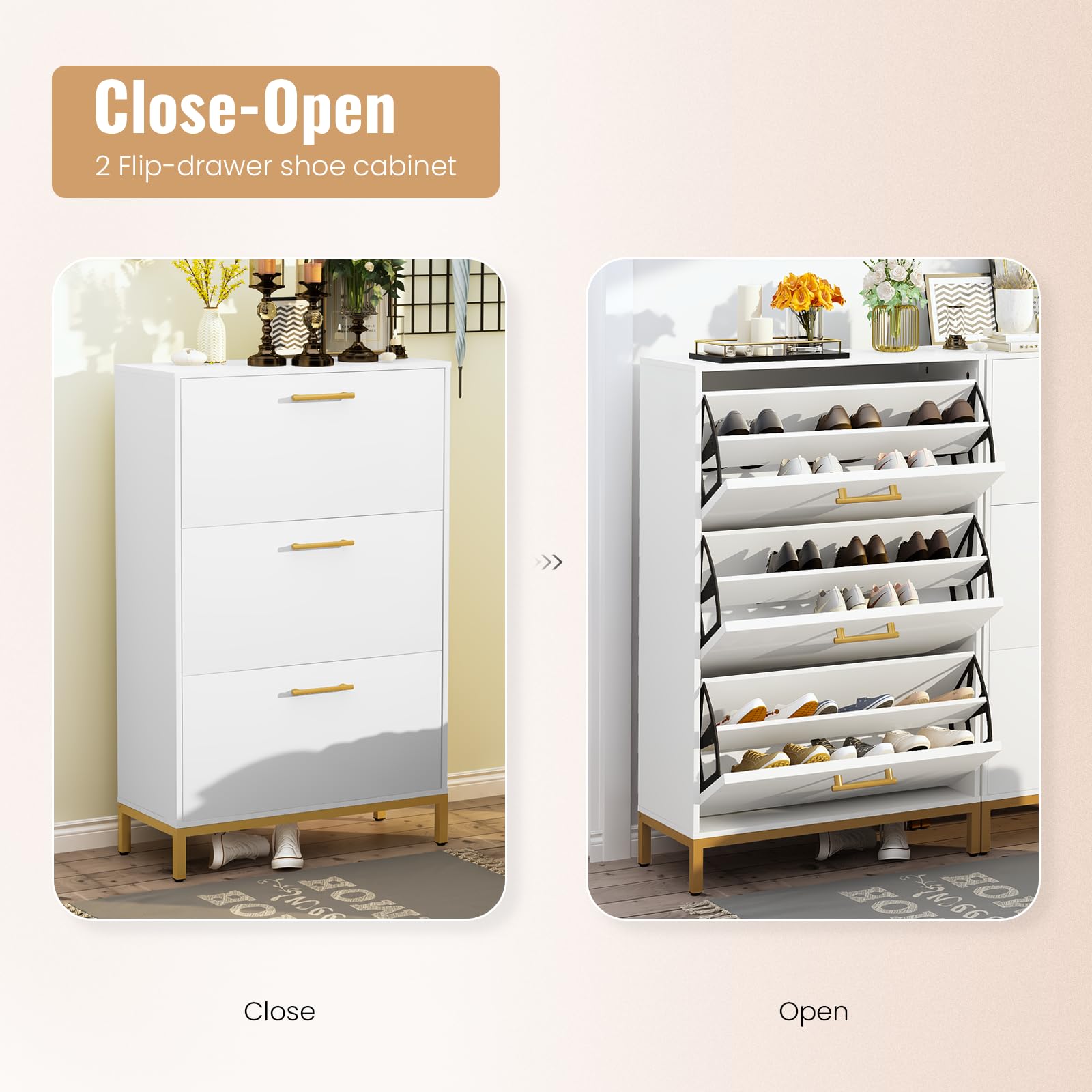- SPACE SAVING FLIP DRAWERS DESIGN : This flip drawer design make the modern freestanding shoe rack save space and easy to open and close. And the shoe storage cabinets with doors can organize all your shoes and create a clean and tidy space at the entrance