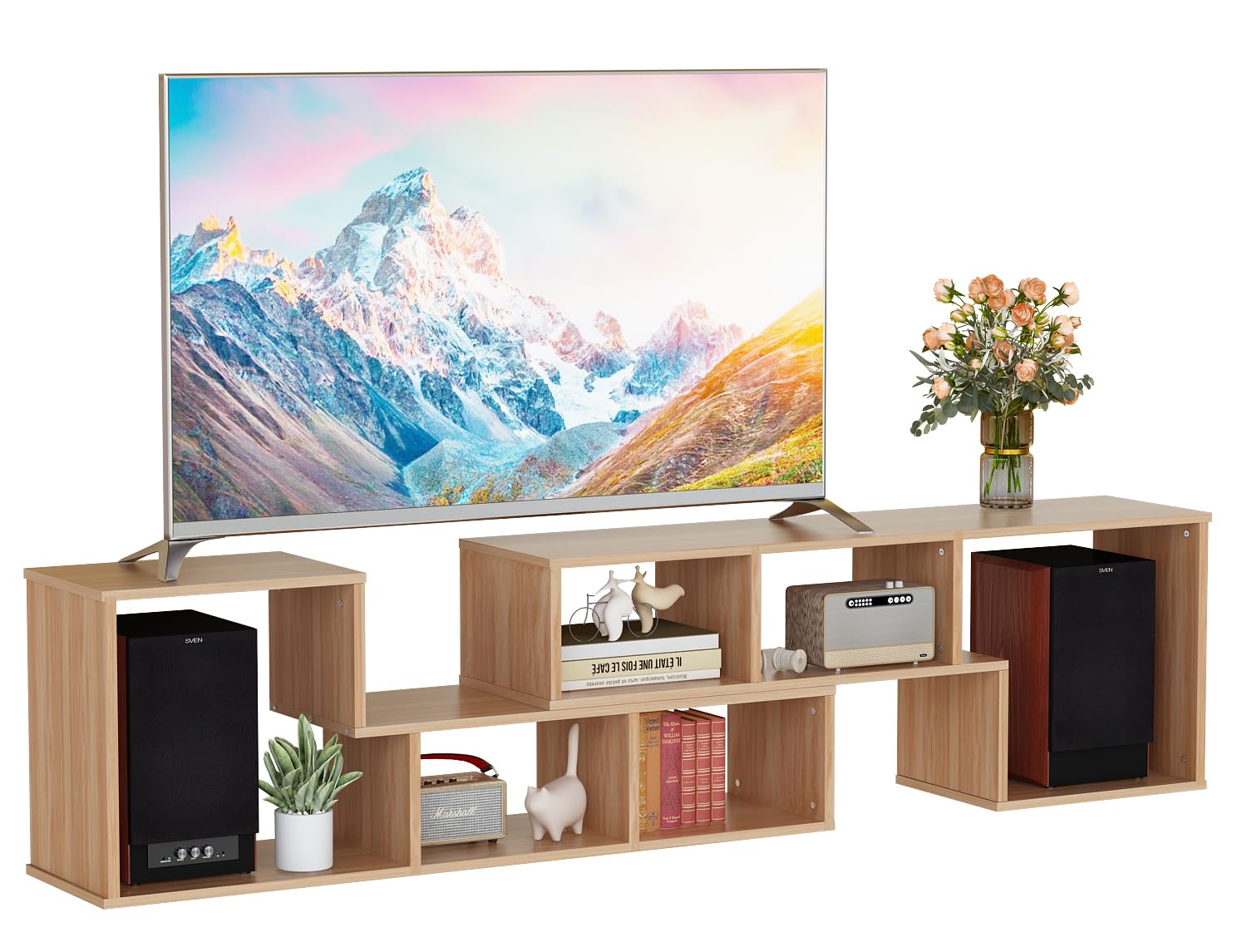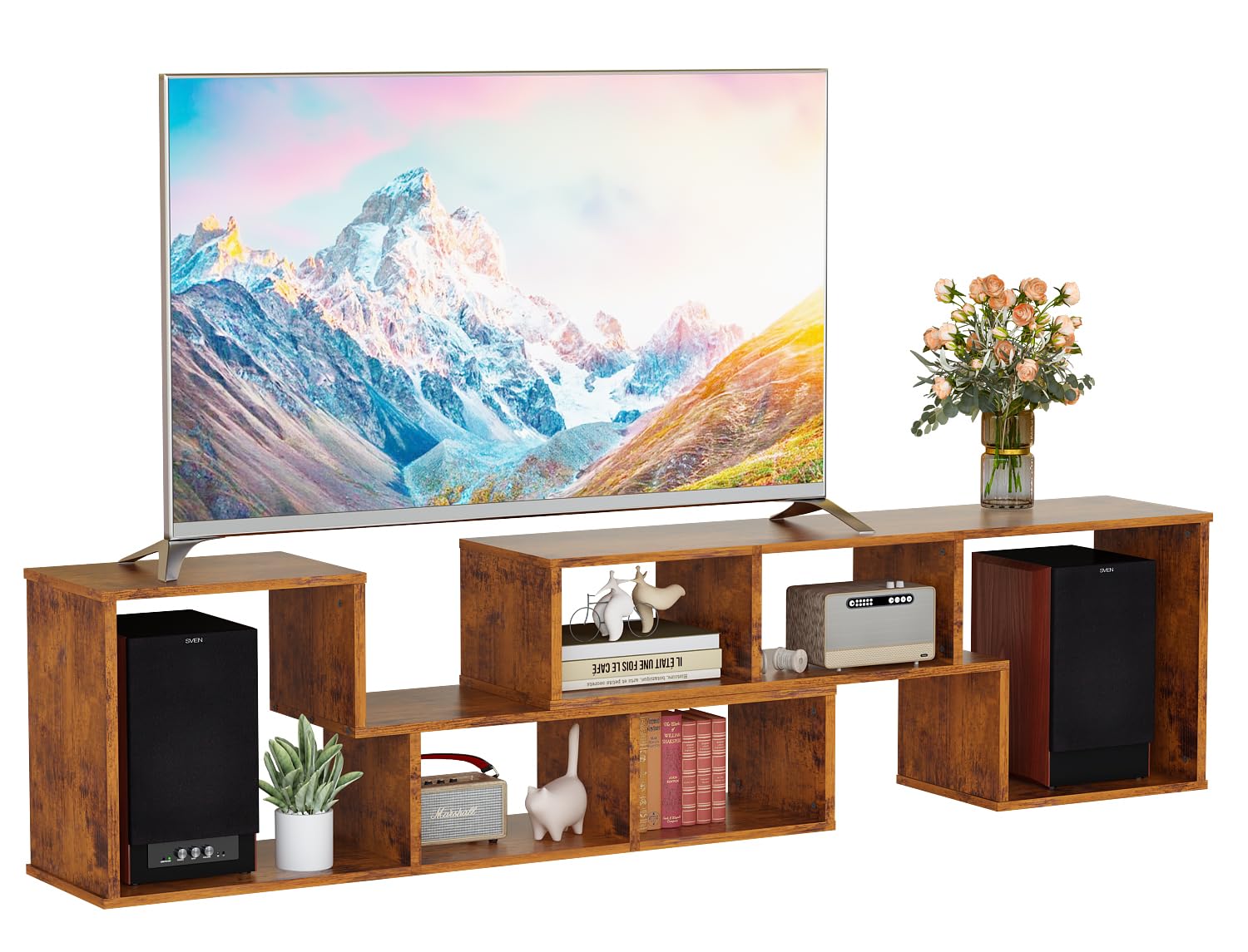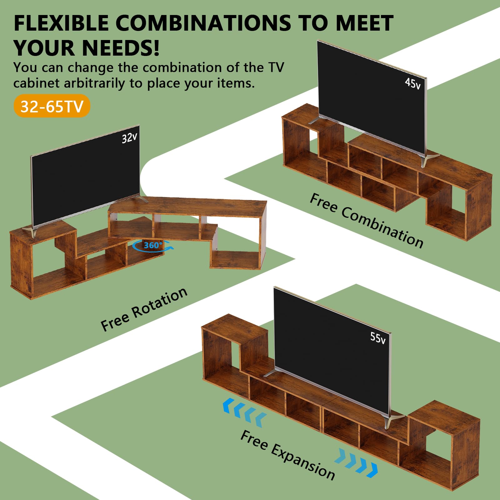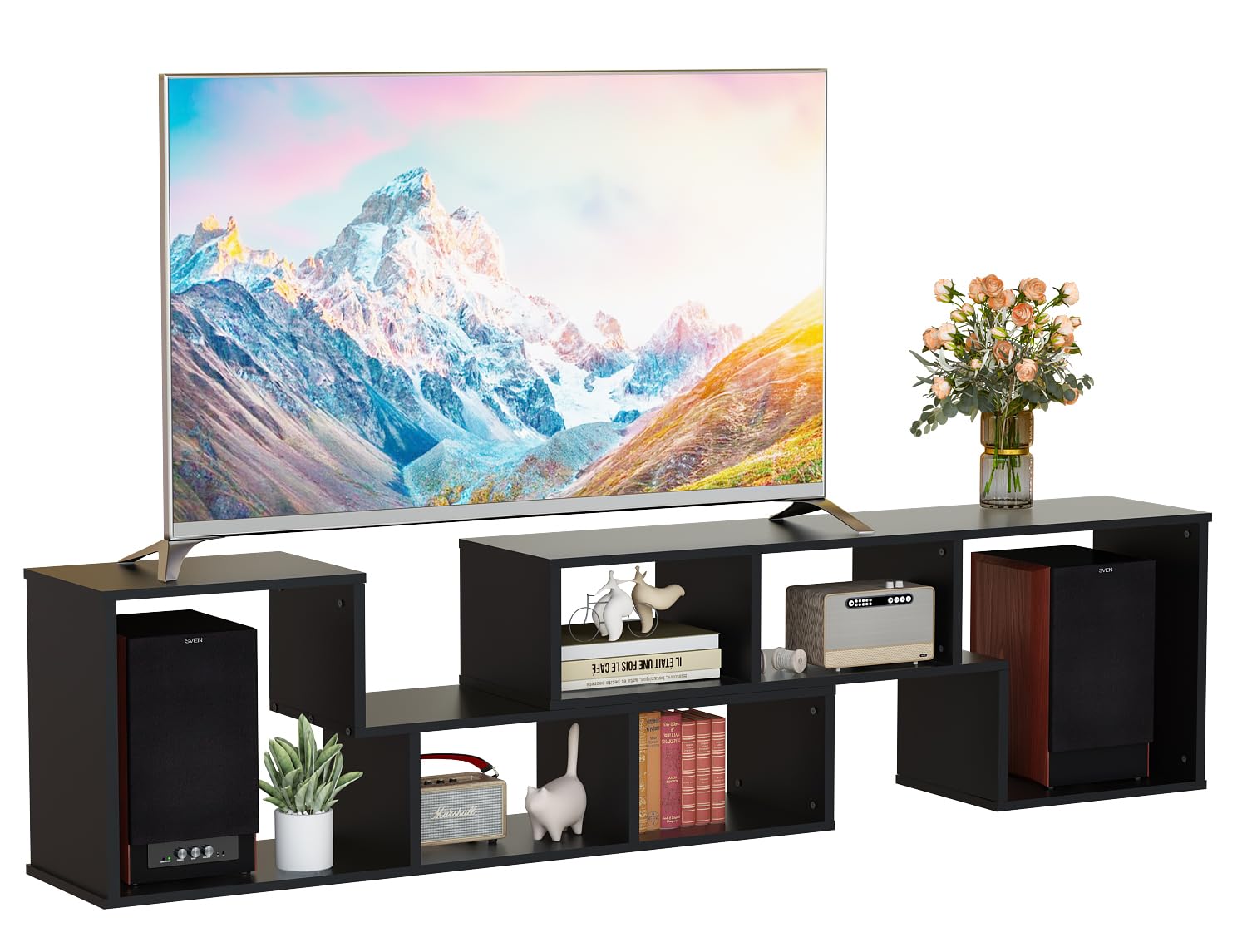 - 【6 Compartments Storage to Save Space】This stylish TV console table is adjustable in length from 55"to 80" and can accommodate up to a 75" TV. In addition, this entertainment center features multiple open cubes with 6 open shelving spaces that provide a large storage capacity to hold your books, picture frames, plants and decorations, remotes, CDs and many more items. A good entertainment center provides enough space for TV boxes, routers, game consoles, speakers and other TV components.