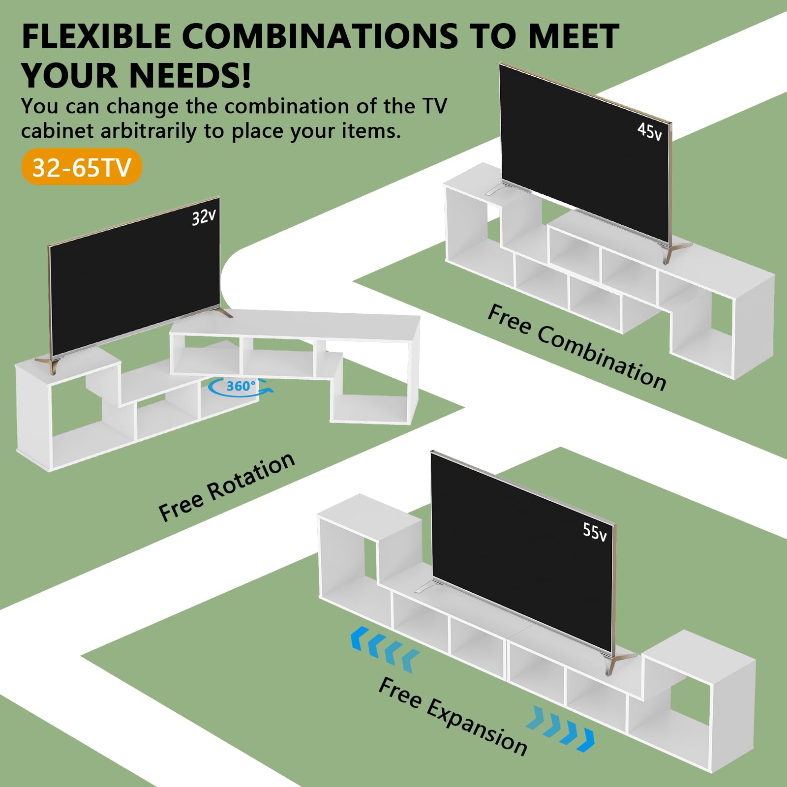 - 【Simple and Practical】With a clean and stylish design, sleek lines and a minimalist look, this TV stand shows your living room a modern style. It consists of 2 cubic L-shaped shelves and also fits a variety of decorating styles. Our entertainment center is made of high quality MDF wood panels that are durable, scratch resistant and easy to clean. This TV stand is perfect as a TV stand for 50", 55", 60", 70" and 75" TVs in your bedroom or living room.