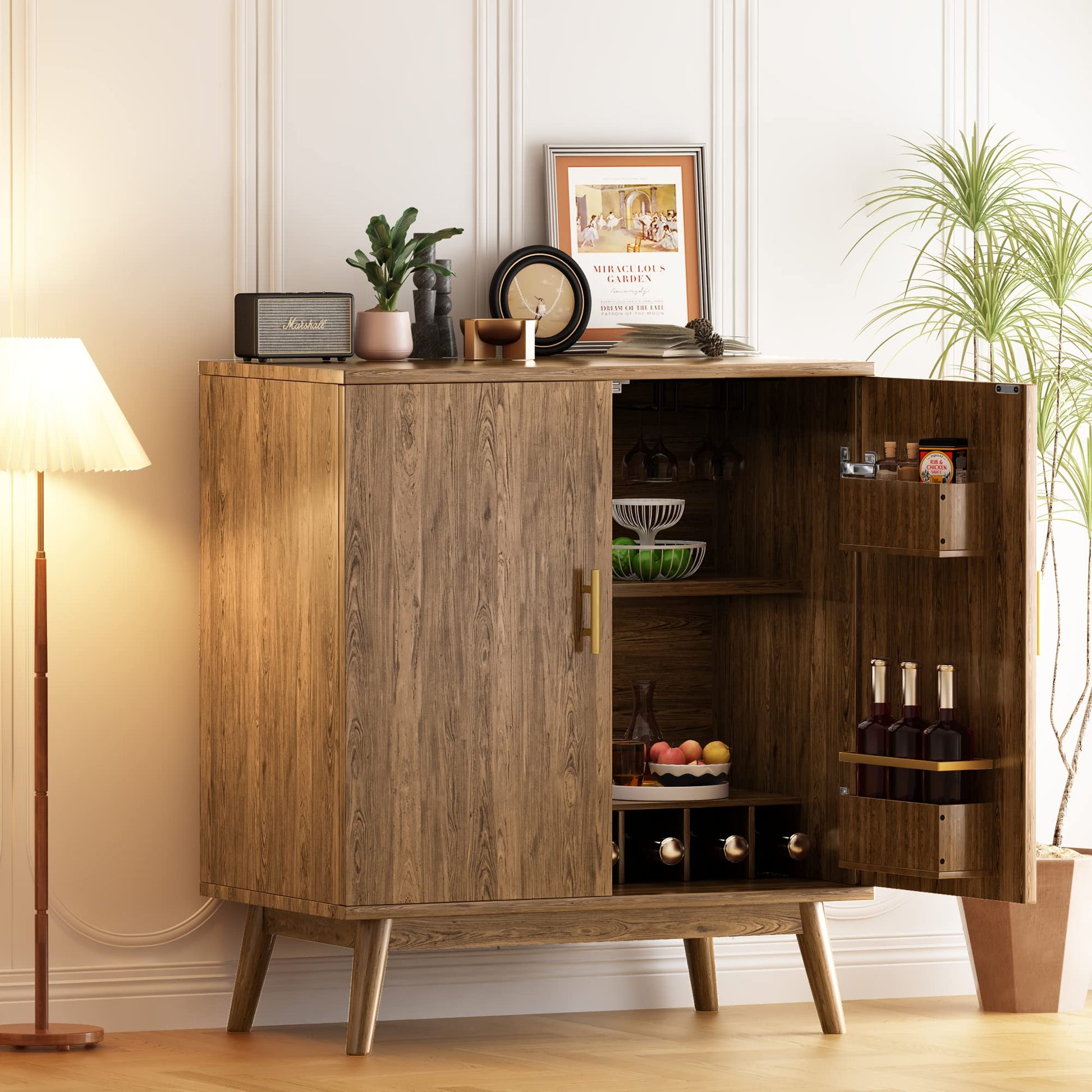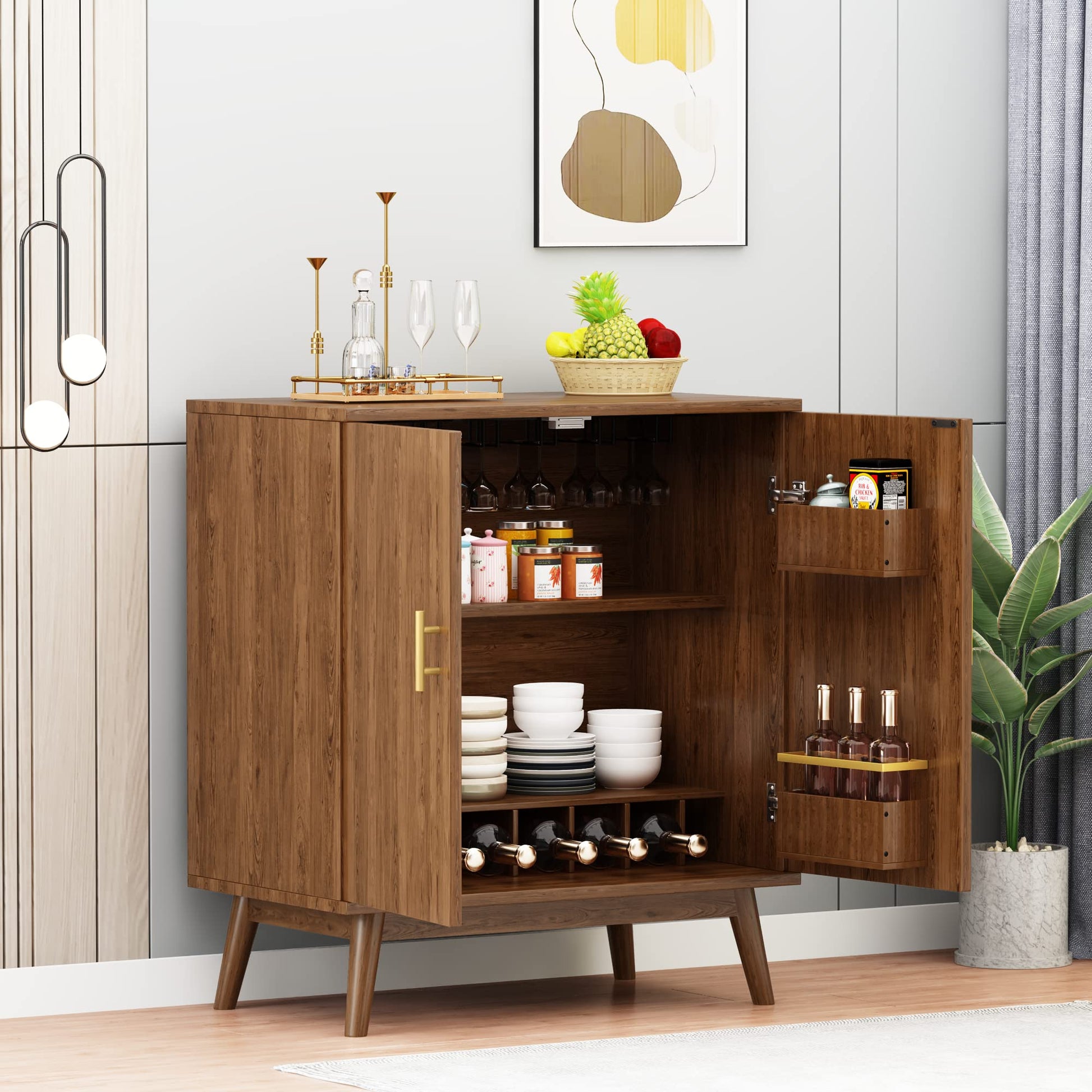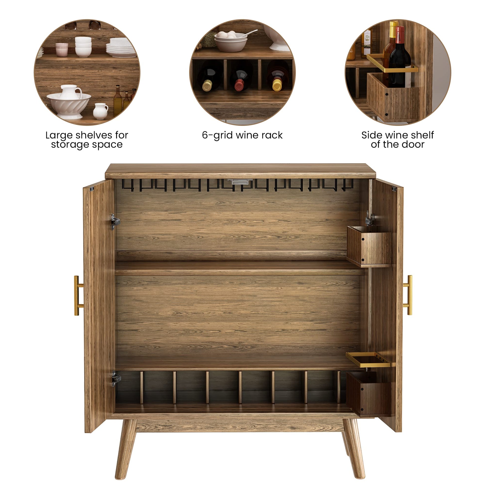 The bar cabinet offers ample storage space with a 6-compartment wine rack, 21 wine glass racks, 2 side racks for wine and spice jars, and 2 additional storage racks. Perfect for wine lovers and collectors, it will accommodate all your storage needs.