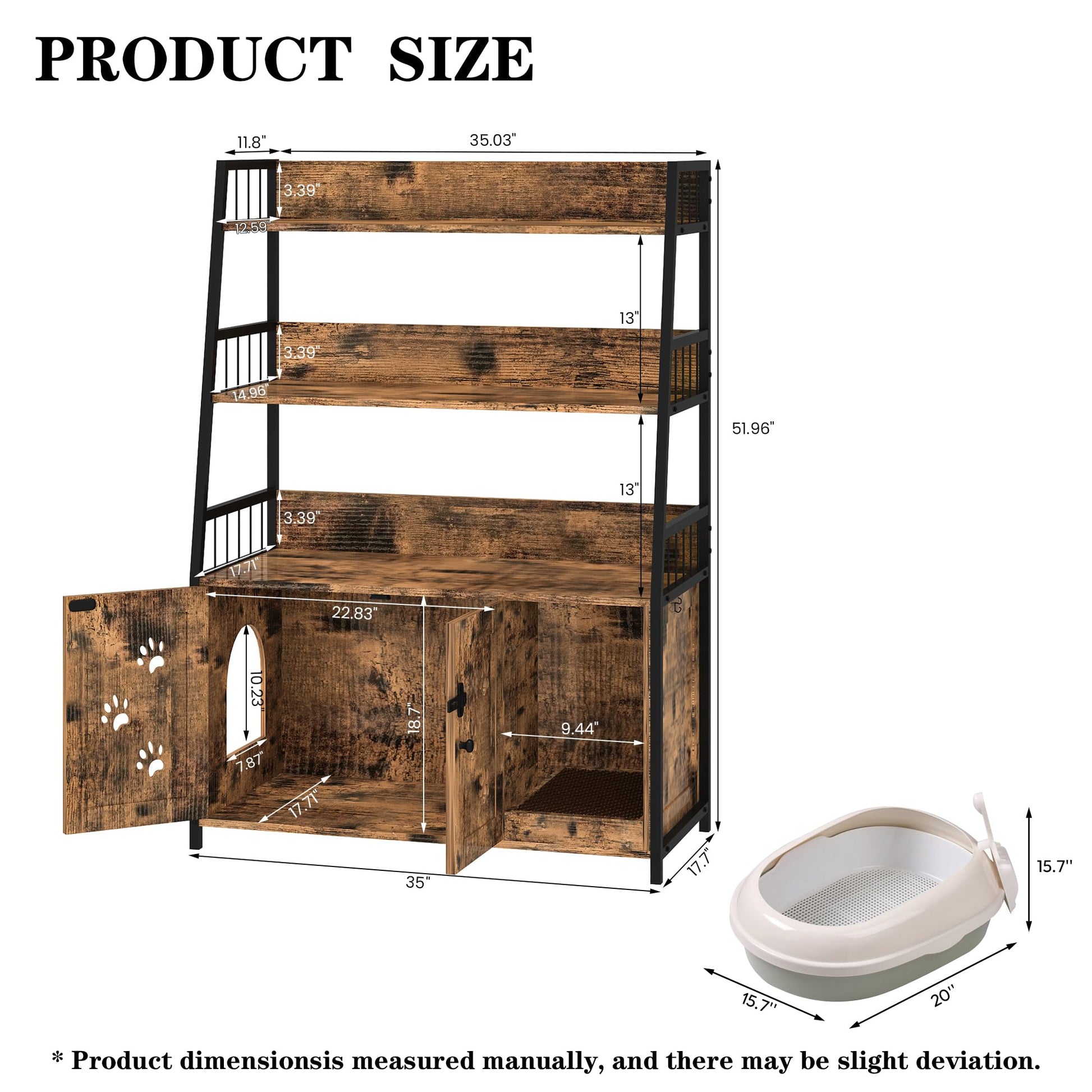 Large Size Design Cat Litter Box Enclosure: The cat litter box enclosure is made of durable MDF board. The overall sturdy metal frame enhances the stability of the litter box shelf. This litter cabinet's overall dimensions are 35" Lx17.7" Wx51.9" H. The inside of the cat cabinet measures 22.8" Lx17.7" Wx18.7" H.