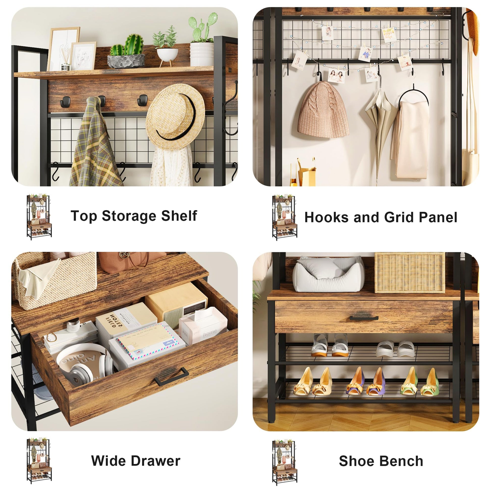 This 5-in-1 hallway coat rack is perfect, it combines a shoe rack, top storage rack and coat rack hooks, storage bench, drawers, etc. The 2-tier grid rack can hold shoes (4-6 pairs), the top shelf can hold hats or plants, photos, key and umbrella hooks, magazines or socks drawers, it is very convenient to put items when guests visit.